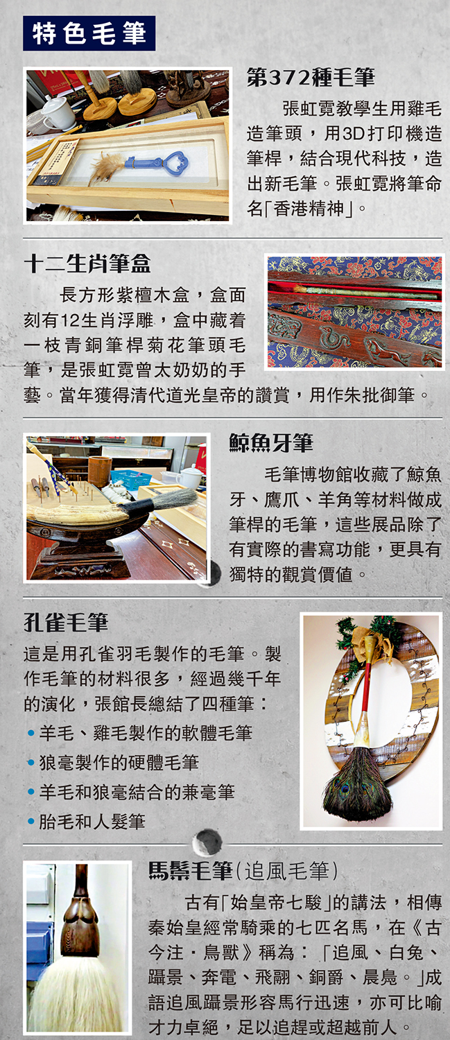 張虹霓教學生用雞毛造筆頭,用3D打印機造筆桿,結合現代科技,造出新毛筆。張虹霓將筆命名「香港精神」。