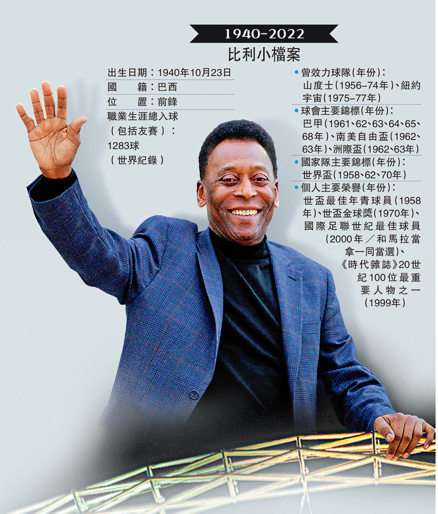 獲廣泛認同為足球歷史上最偉大球員的巴西「球王」比利,於巴西當地時間周四下午3時27分在聖保羅的醫院離世,終年82歲。近日一直守在病床前陪伴走人生最後一段路的比利女兒,在社交媒體公布父親去世的消息;巴西政府宣布全國哀悼3天,並和比利的家人着手籌辦比利的喪禮,包括下周一及周二在比利母會山度士球場舉辦公開喪禮,遺體將安葬在一個私人墓地。\大公報記者 譚德龍