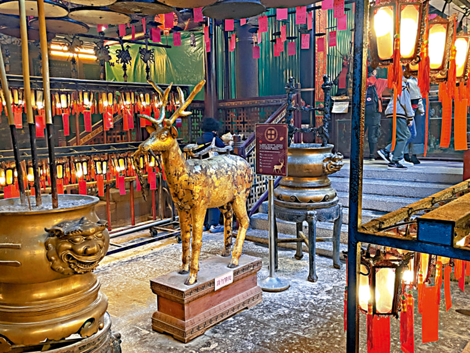文武廟的祈願金鹿也是一大亮點。鹿,寓意俸祿,是文昌帝君座前神獸。善信可到文武廟內櫃位請金箔,並將金箔放於合十的雙手中並將自己的祈願告知文昌帝君,誠心許願,並小心打開金箔包裝,輕輕貼在金鹿上。