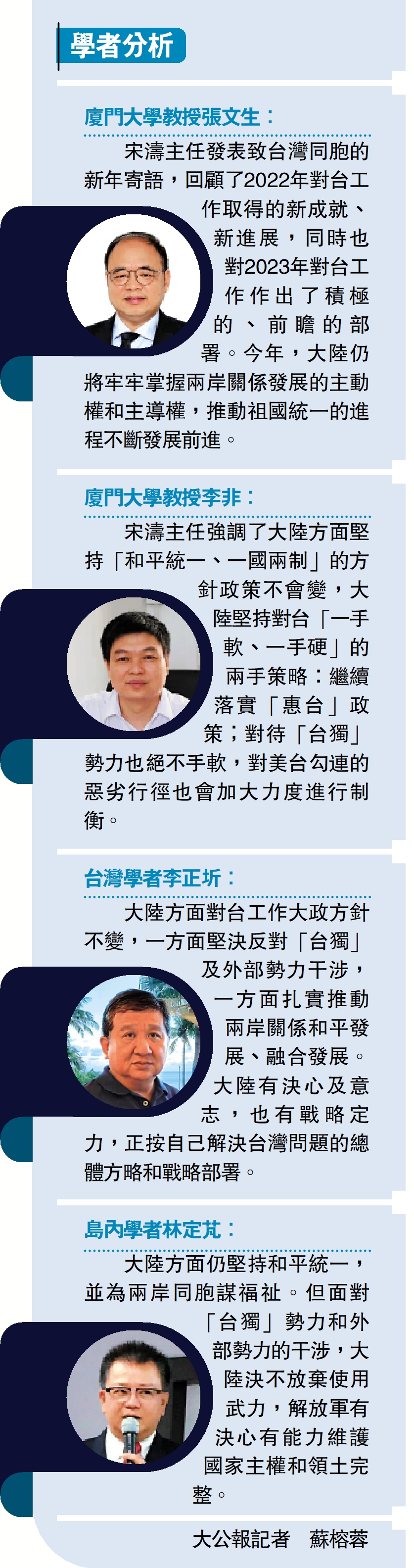 大陸方面對台工作大政方針不變,一方面堅決反對「台獨」及外部勢力干涉,一方面扎實推動兩岸關係和平發展、融合發展。大陸有決心及意志,也有戰略定力,正按自己解決台灣問題的總體方略和戰略部署。