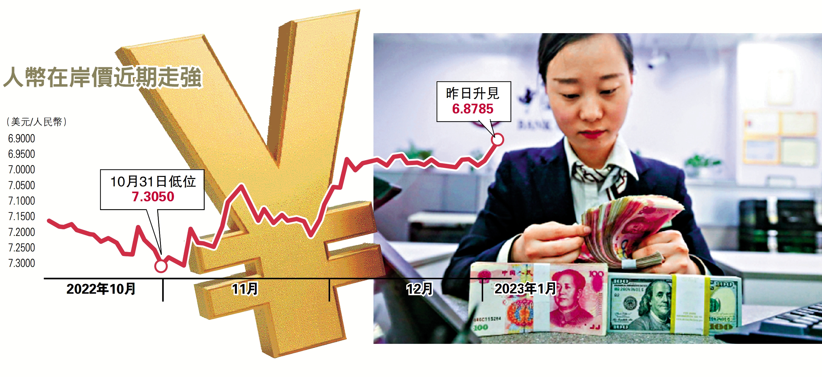 隨着內地優化疫情防控工作取得新進展,對內對外生活交流逐漸復常,支持中國經濟繼續向好發展及看好中國資產表現,假期後首個交易日人民幣兌美元強勢反彈,在岸及離岸人民幣雙雙升破6.9關口,曾見6.87水平,漲幅分別近800及500個基點,創去年9月以來新高。在岸人民幣昨日日盤收盤報6.9050,較上個交易日大漲464個基點。分析認為,在美聯儲最強緊縮預期過去、中國經濟預期轉好,以及中國製造業升級延續背景下,今年人民幣兌美元匯率總體偏強,全年人民幣匯率或高見6.5至6.6區間。