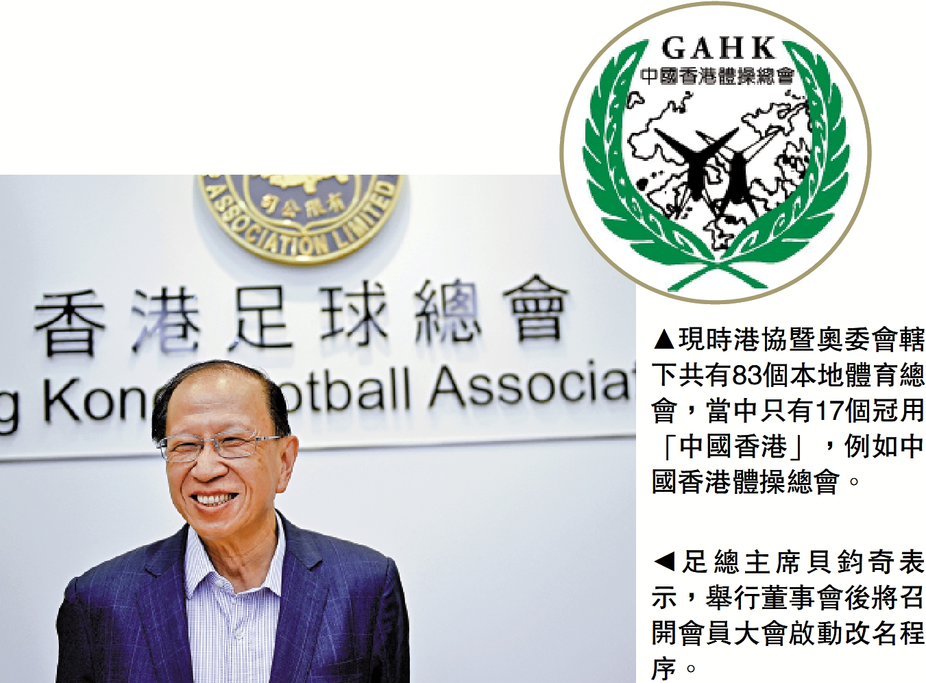 香港足球總會主席貝鈞奇表示,足總回歸後雖然一直未有改名,但香港足球隊一直以「中國香港」名義參與國際賽。他同意改名,預計足總在舉行董事會後,召開會員大會啟動改名程序,並會通知國際足聯及亞洲足協等國際組織。