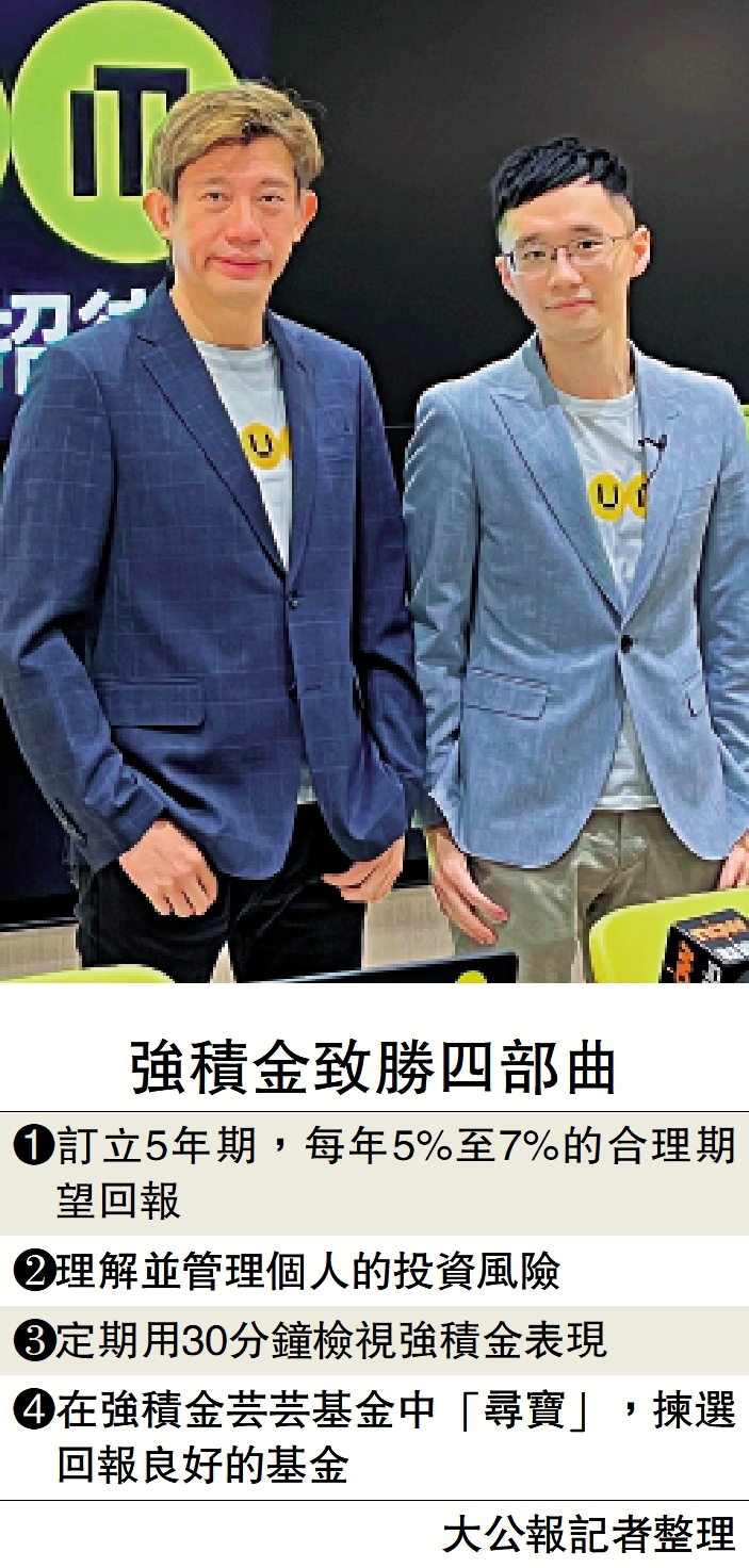 GUM執行董事王玉麟提出「強積金致勝四部曲」,建議為訂立5年期每年5%至7%合理期望回報;理解並管理自己的投資風險;定期用30分鐘檢視強積金表現;及在強積金芸芸基金中「尋寶」,揀選回報良好的基金。