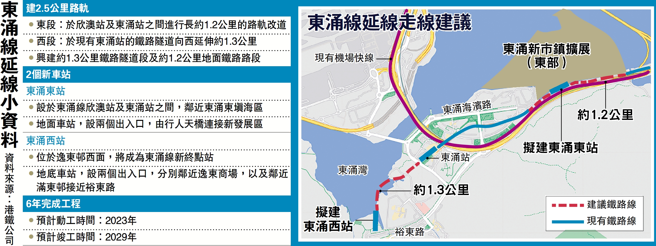 東涌線延線是《鐵路發展策略2014》中建議的七個鐵路方案之一,主要分為「東涌東段」及「東涌西段」兩部分。其中「東涌東段」將於現有欣澳站及東涌站之間,進行長約1.2公里的路軌改道,並於東涌東填海區新設東涌東站;東涌東站為地面車站,設有高架車站大堂。至於「東涌西段」,將從現有東涌站的鐵路隧道向西延伸約1.3公里,於逸東邨以西建造東涌西站;東涌西站為地底車站,將成為東涌線的新終點站。