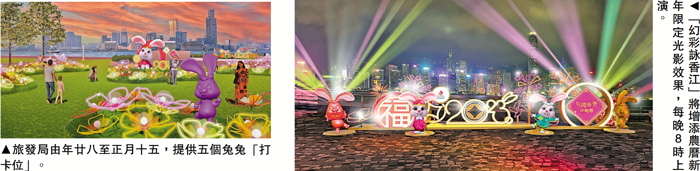 癸卯兔年將至,新春氣氛漸濃,各區陸續推出賀年活動。康文署昨晚起,率先在香港文化中心露天廣場舉行市區春節綵燈展,製作兔子、醒獅、新春應節食品和傳統點心的綵燈,歡迎市民到場「打卡」拍照,費用全免。香港旅遊發展局沿海濱多個地點設置「福兔」裝飾,中環碼頭更加首度變身,一隻高8米的巨型福兔,躲在樓頂跟大家打招呼、迎新歲。