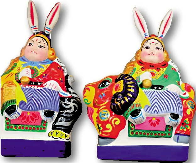 老舍先生對此寫到,在街上香艷的果攤中間,兔兒爺攤子一層層地擺起粉面彩身、身後插着旗傘的兔兒爺──有大有小,都一樣的漂亮工細,有的騎着老虎,有的坐着蓮花,有的肩着剃頭挑兒,有的背着鮮紅的小木櫃,而「這雕塑的小品,給千千萬萬的兒童心中種下美的種子。」