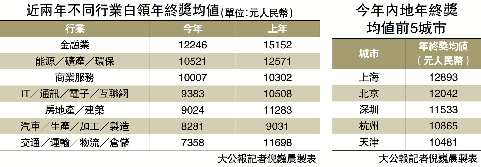 【大公報訊】記者倪巍晨上海報道:癸卯兔年新春將至,在線獵頭智聯招聘發布的「2022年內地白領年終獎調研」顯示,2023年初獲得的2022年年終獎,有四分之一的白領確定能拿到,均值為8428元(人民幣,下同),較上年下跌17.6%。金融業年終獎仍蟬聯各行業之首,均值為12246元,低於上年15152元的均值。