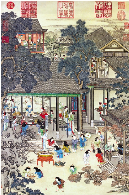 清代宮廷畫家姚文瀚的《歲朝歡慶圖》軸(附圖,局部),描繪了大戶人家過年闔家歡慶團圓的場面。整幅畫構圖繁密,卻繁而不亂,秩序井然。
