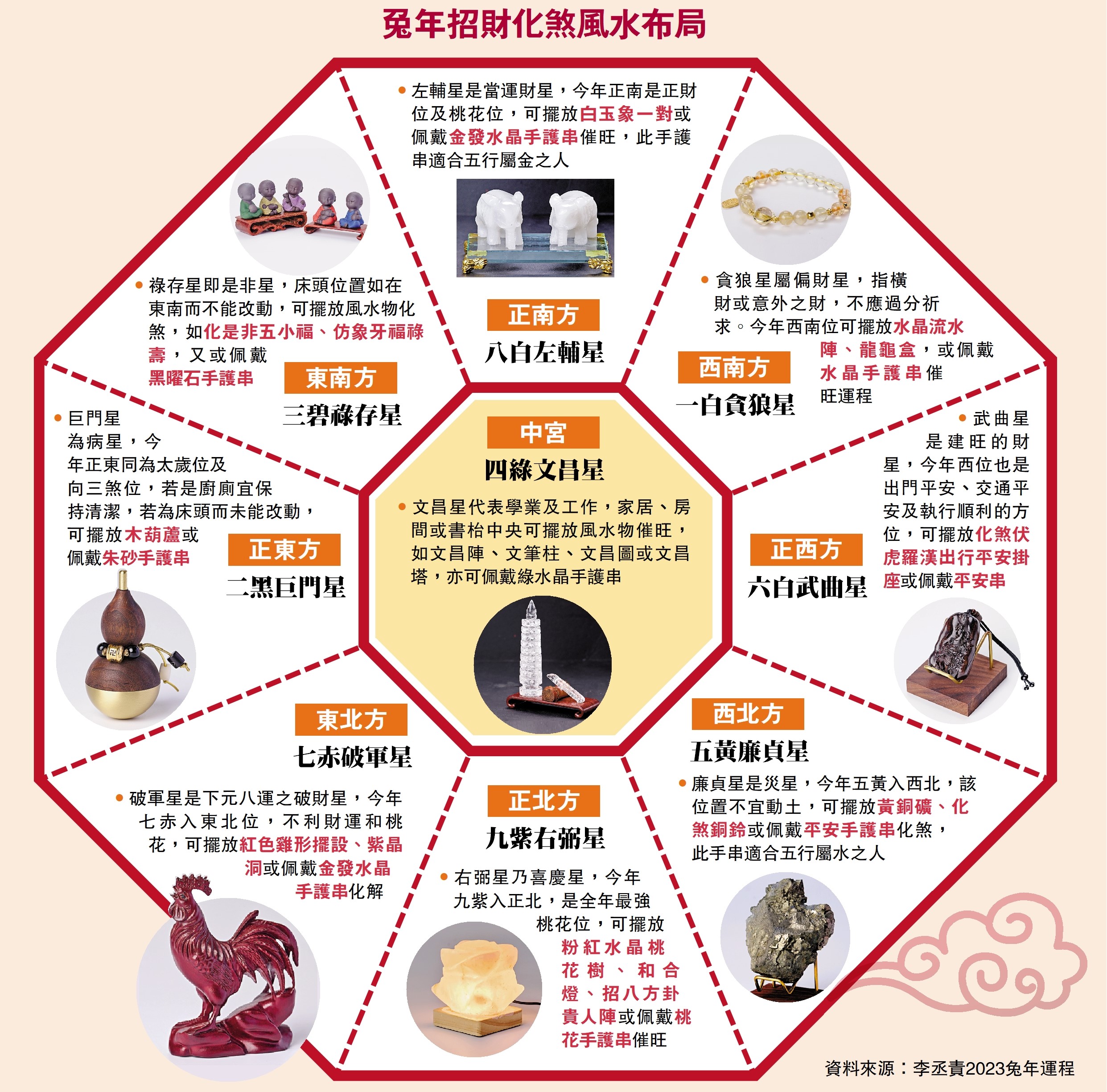 「送虎迎兔」,今年兔年「四綠」入中宮,代表文昌,著名風水玄學專家李丞責說,市民可於家居、房間、書房甚至書枱的中央位置,選擇合適的風水物品擺設,以作催旺。