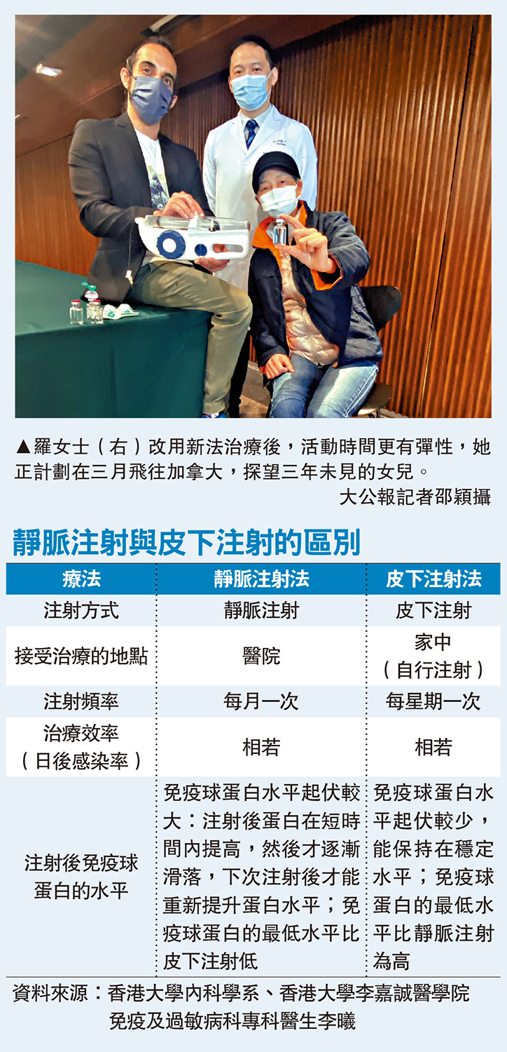 【大公報訊】記者邵穎報道:患有免疫力缺乏症的病人須定期補充免疫球蛋白,如使用傳統的靜脈注射,病人須定期往返醫院,時間經濟成本高,對生活構成不便。本港近年引入新療法,以皮下注射的方式,患者可在家中自行注射,每位病人每年的醫療成本可省約2.5萬元。有患者表示,三月將飛加拿大探望三年未見的女兒,感嘆終於得以自如安排時間──「未諗過可以行得開」。