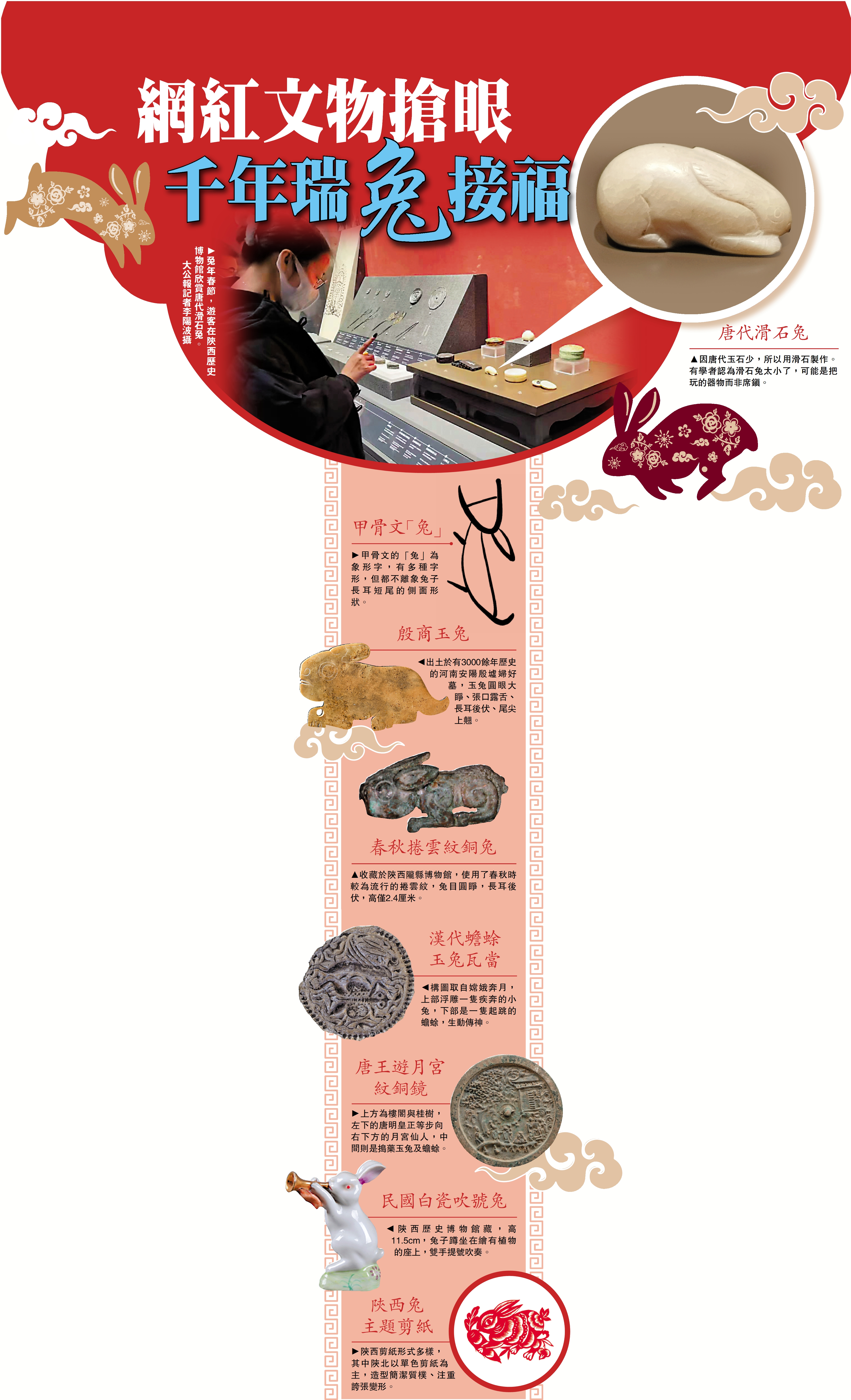 「媽媽,快看,這好像一個鼠標(港稱滑鼠)。」「孩子,那叫滑石兔,是唐代的玉兔。」兔年春節,對歷史文化情有獨鍾的西安小學生李芷炘,拉着媽媽再次來到陝西歷史博物館。隔着玻璃,她一眼就看見了這個雖然個頭不大,但卻與眾不同的文物。癸卯兔年,兔子當仁不讓地成為了主角。連日來,陝西各大博物館兔文物展櫃都成了最火的打卡地,而櫃內的兔文物更成為了整個博物館最耀眼的「明星」。\大公報記者 李陽波