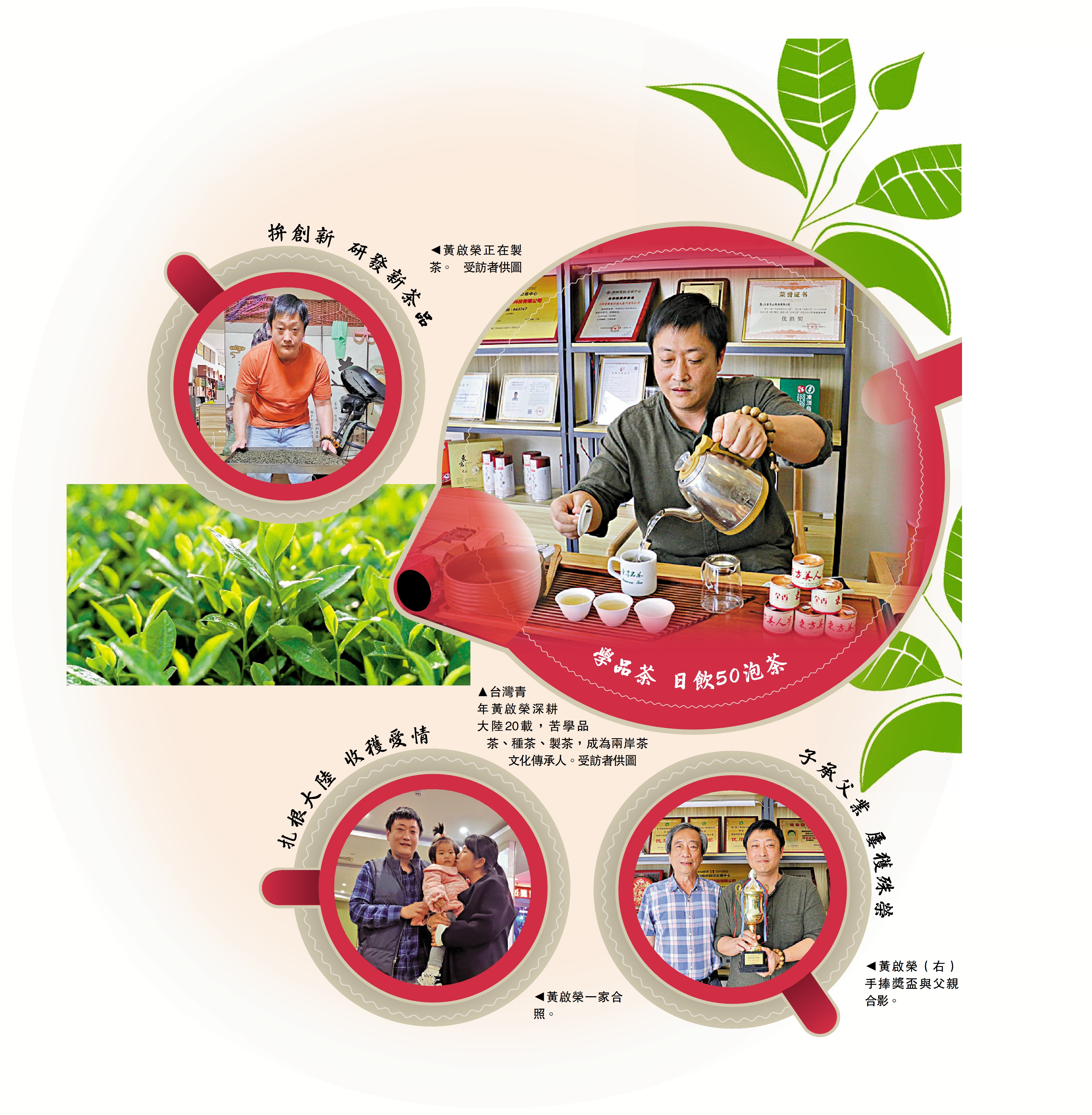 2003年,台青黃啟榮跟隨父親的腳步,從台灣台中西進福建。20年來,品茶、評茶、種茶、製茶、售茶……黃啟榮從個性張揚的年輕人,逐漸接過父親的班,成長為兩岸茶文化傳承人。「早年茶葉從大陸、從福建到了台灣,我們又把台灣的茶帶回大陸種,我們一家從此也扎根大陸。也因為扎根大陸,我娶了大陸的太太,成就了一段兩岸姻緣。」黃啟榮說,如今他已把事業重心放在大陸,也呼喚有更多台青到大陸尋找「機和緣」。\大公報記者 蔣煌基報道