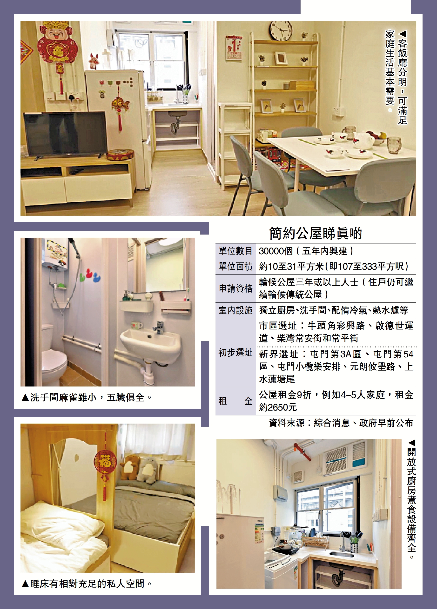 簡約公屋單位真面目曝光。房屋局近日邀請劏房戶,參觀供四至五人家庭入住的簡約公屋示範單位,單位內有足夠活動空間,客飯廳、獨立廚廁、並可放置三張床,房屋局局長何永賢形容,簡約公屋是「幫助劏房居民的救生艇」,價值無法計算。消息稱,政府敲定簡約公屋八幅用地選址,三幅市區地的單位量約佔總供應一半,整體項目費用較原預算減少近10億元,降至約260億元,打算分兩期向立法會申請撥款,第一期先申請150億元。\大公報記者 賴振雄 梁少儀
