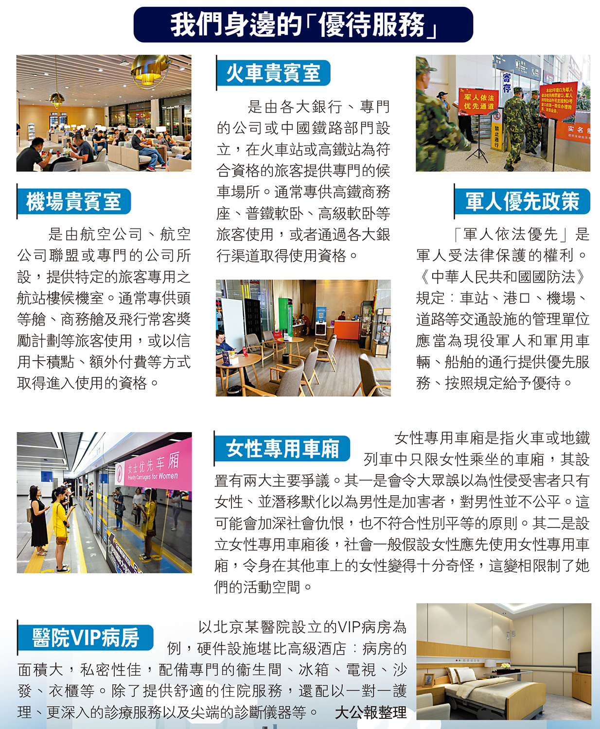 「軍人依法優先」是軍人受法律保護的權利。《中華人民共和國國防法》規定:車站、港口、機場、道路等交通設施的管理單位應當為現役軍人和軍用車輛、船舶的通行提供優先服務、按照規定給予優待。