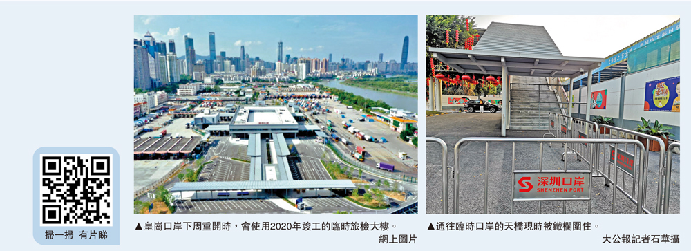 深圳市政府2019年提出原址重建皇崗口岸計劃,並建議在新口岸實施「一地兩檢」。記者昨日在口岸外圍所見,原旅檢大樓被推倒重建,過境天橋被拆了一半,只剩下銹跡斑斑的接駁位。目前,皇崗口岸重建「三步走」已完成「建設臨時旅檢場地」和「拆除老口岸旅檢區」前兩步,第三步建設的新口岸正在施工。