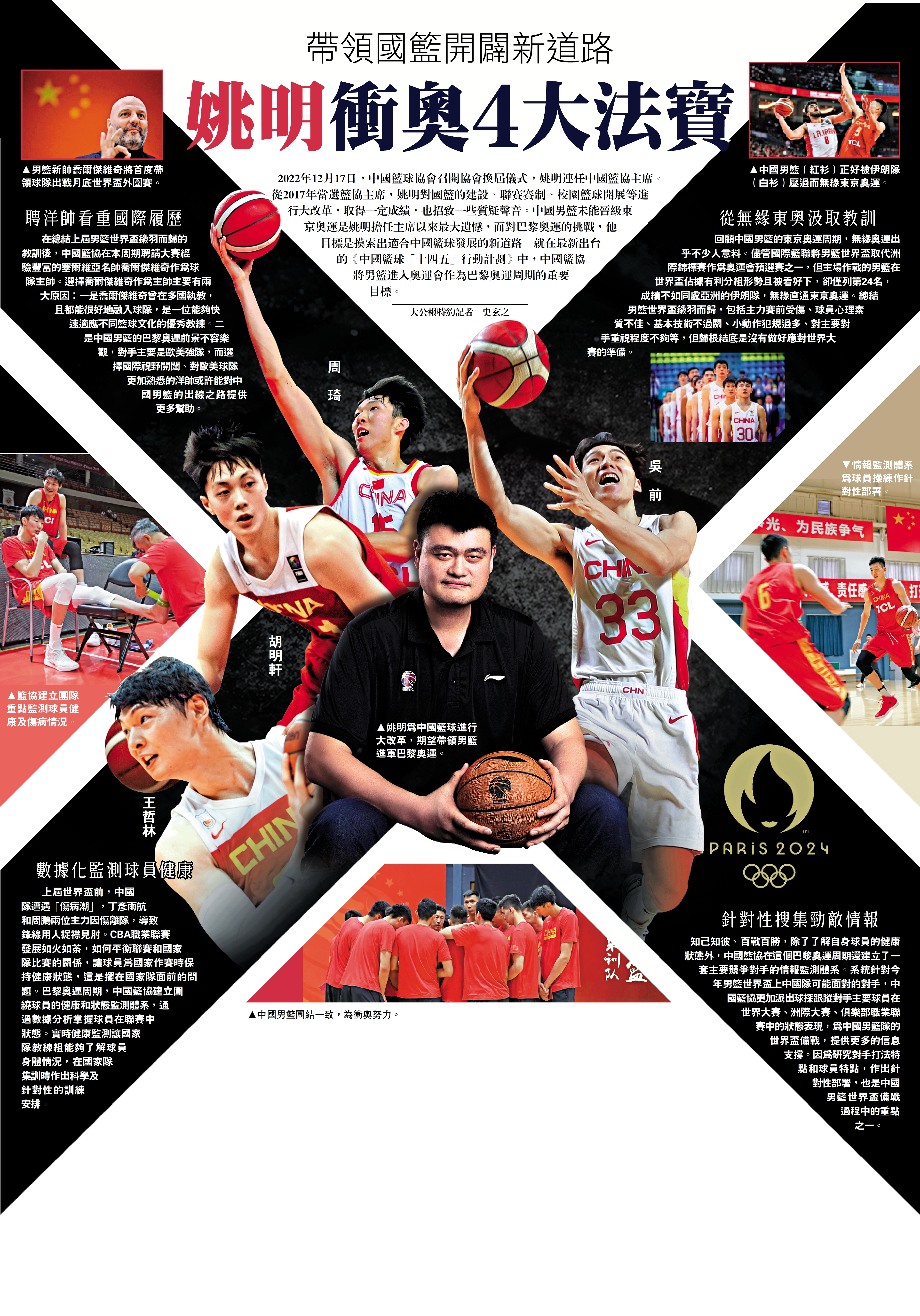 2022年12月17日,中國籃球協會召開協會換屆儀式,姚明連任中國籃協主席。從2017年當選籃協主席,姚明對國籃的建設、聯賽賽制、校園籃球開展等進行大改革,取得一定成績,也招致一些質疑聲音。中國男籃未能晉級東京奧運是姚明擔任主席以來最大遺憾,面對巴黎奧運的挑戰,他目標是摸索出適合中國籃球發展的新道路。就在最新出台的《中國籃球「十四五」行動計劃》中,中國籃協將男籃進入奧運會作為巴黎奧運周期的重要目標。\大公報特約記者 史玄之