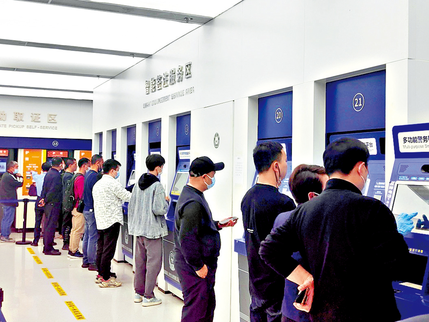記者在深圳市羅湖區行政服務大廳看到,中午還未開放時,門前隊伍就已排成長龍。市民溫小姐說,自己排隊用了一個小時,「我就是為了等『一簽多行』,隨到隨簽特別方便」。在服務大廳的智能簽註服務區,擺放了十餘台港澳自助簽註機,排隊的隊尾一直到門外,還接連不斷有市民過來等候簽註。有市民表示,自助辦理簽註十分快捷,熟悉操作流程的,3分鐘就能出簽。