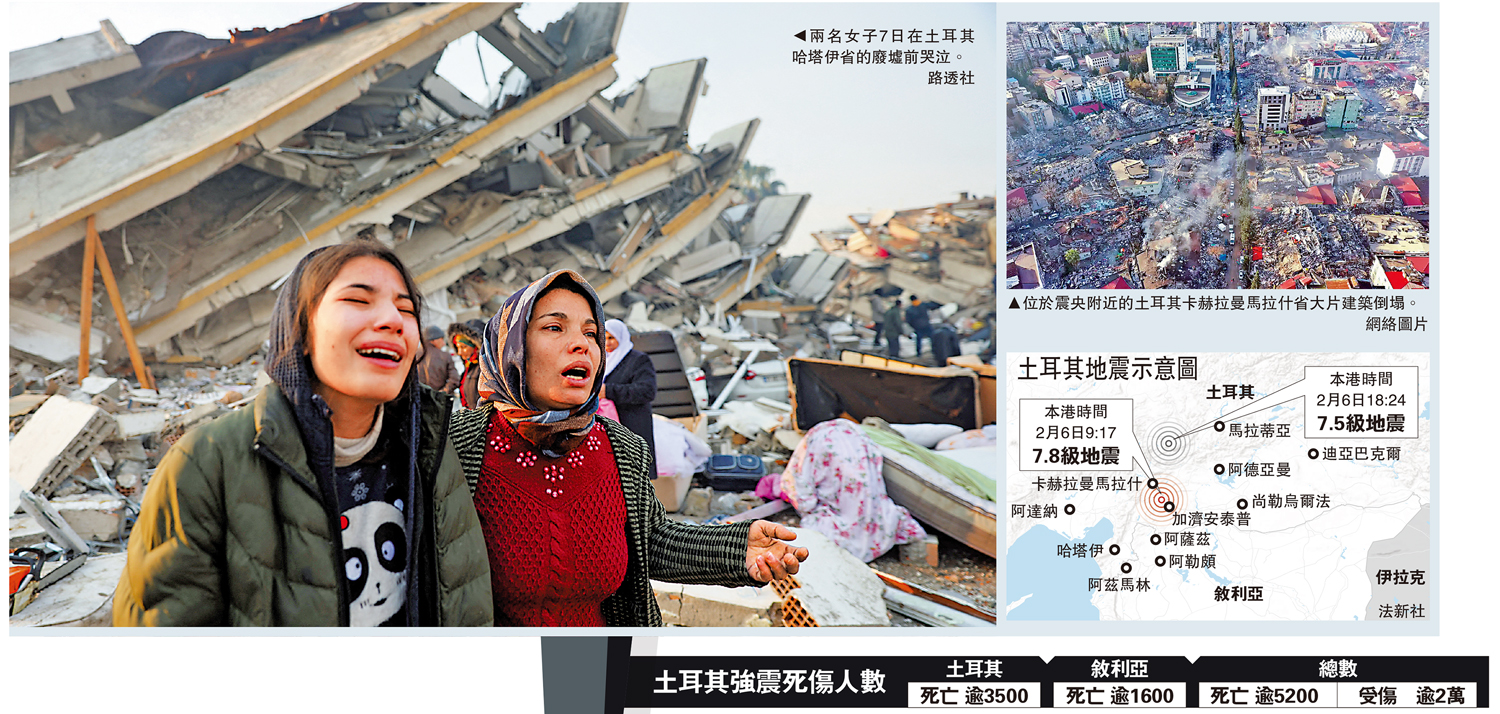 【大公報訊】綜合美聯社、《衛報》、CNN報道:土耳其和敘利亞邊境發生7.8級強震,隨後發生過百次4級以上餘震。截至本港時間2月8日凌晨,地震已導致土敘兩國逾5200人死亡,超過2萬人受傷。世衞組織警告,本次地震造成的死亡人數可能升到2萬人,約2300萬人受災,其中500萬為弱勢人群。土耳其總統埃爾多安7日宣布,該國受地震影響的10個省份進入為期3個月的緊急狀態。