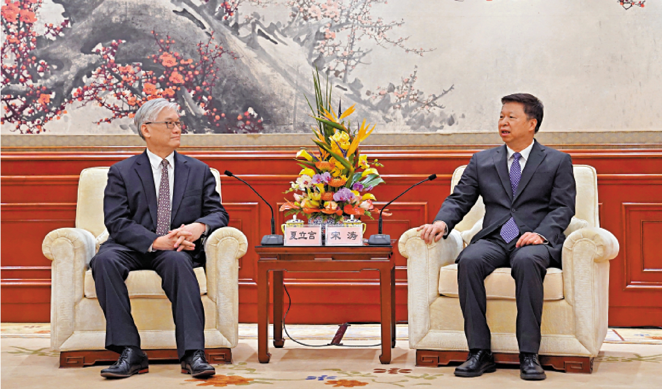 【大公報訊】據新華社報道:中共中央台辦、國務院台辦主任宋濤9日在北京會見來訪的中國國民黨副主席夏立言一行。宋濤歡迎夏立言率團來訪,表示我們將深入貫徹中共二十大精神和新時代黨解決台灣問題的總體方略,全面落實習近平總書記對台工作重要指示精神,願在堅持「九二共識」、反對「台獨」的共同政治基礎上,同中國國民黨加強交往,增進互信,攜手推動兩黨關係和兩岸關係向前發展,共同努力為台海謀和平、為同胞謀福祉、為民族謀復興。我們將繼續秉持「兩岸一家親」理念,尊重、關愛、造福台灣同胞,深化兩岸各領域交流合作,促進兩岸同胞心靈契合。