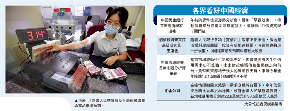 內地1月新增人民幣貸款達4.9萬億元(人民幣,下同)創單月最高;同期社融規模增量5.98萬億元,雖比上年同期少1959億元,但較前值1.31萬億元大幅反彈。分析指出,疫情後中國經濟加速恢復帶來融資需求回升;「寬信用」政策的持續推進也帶動年初新增信貸規模實現開門紅,隨着人民銀行各項「寬信用」政策的不斷推進,中國經濟增長預期將得到較大改善。\大公報記者 倪巍晨