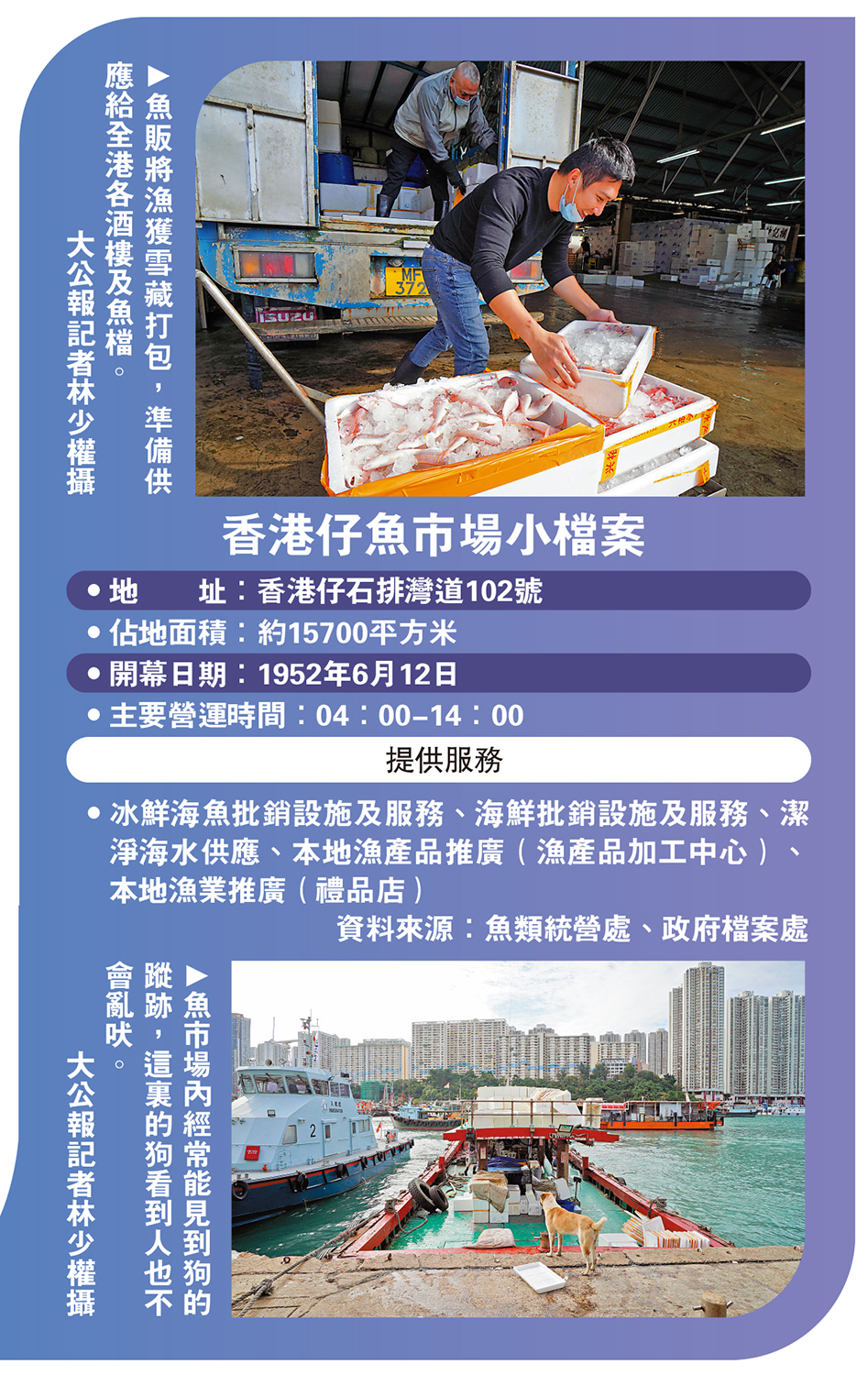 •冰鮮海魚批銷設施及服務、海鮮批銷設施及服務、潔淨海水供應、本地漁產品推廣(漁產品加工中心)、本地漁業推廣(禮品店)