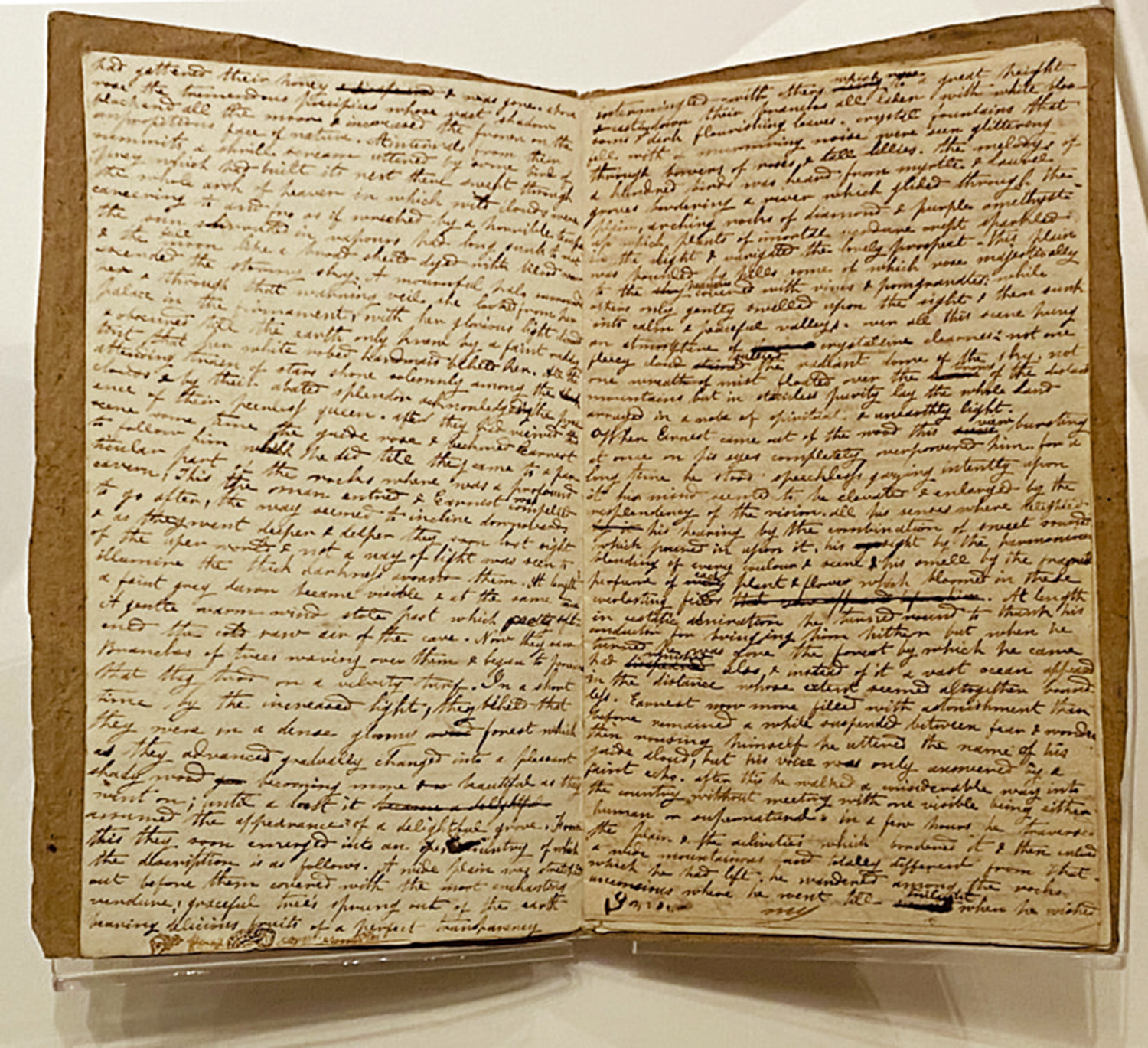 這次紐約圖書館展出的是夏綠蒂十五歲時的小說手稿《歐內斯特·阿朗伯特歷險記》。在這裏,這位天才少女已然呈現了她的文學才華和編故事的能力。這本手稿密密麻麻寫滿了她的冥想和奇幻憧憬,是《簡·愛》作者最早的練筆之作。這部小說寫的是主人公歐內斯特渴望訪問仙境,在一個秋夕,仙女魯弗斯華納降臨帶他見證了超自然世界的奇觀:由青金石和液態鑽石組成的壯麗宮殿、天堂般的花園、寶石鑲嵌街道的城市。戀棧經年後,歐內斯特酷思故鄉,後由一種魔藥把他帶到了一個綠色的山谷,在那裏他遇到了同樣一位被仙女俘虜但經歷過海底恐怖的老人。歐內斯特決定在這個似乎擁有永恆夏天的山谷中度過餘生。
