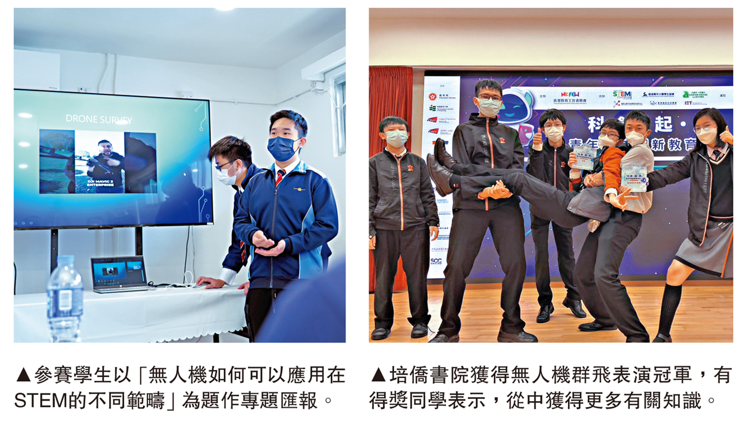 【大公報訊】記者蘇薇報道:由香港教育工作者聯會主辦,中國銀行(香港)資助的「科創·起·承」青年科技創新教育計劃,上周六於愛國教育支援中心舉行高中組比賽。賽事設「無人機群飛表演」和「演講」兩部分,學生先設計程式令無人機在音樂伴奏下自動完成比賽任務,再以「無人機如何可以應用在STEM的不同範疇」為題作專題匯報。賽事設9個獎項,由培僑書院獲得無人機群飛表演冠軍,創知中學獲得全場最佳匯報獎。