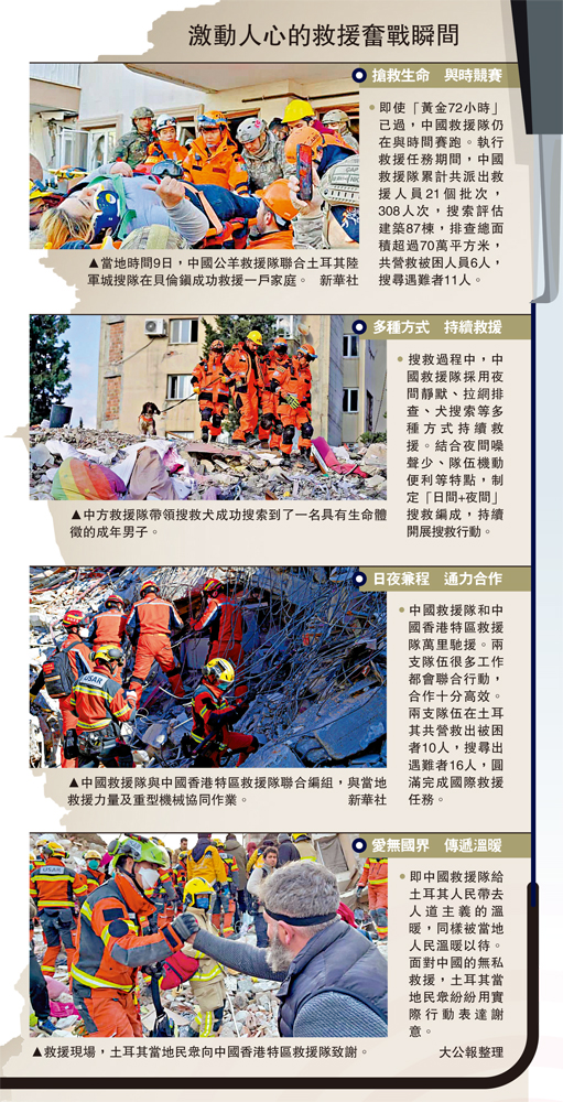 •即使「黃金72小時」已過,中國救援隊仍在與時間賽跑。執行救援任務期間,中國救援隊累計共派出救援人員21個批次,308人次,搜索評估建築87棟,排查總面積超過70萬平方米,共營救被困人員6人,搜尋遇難者11人。