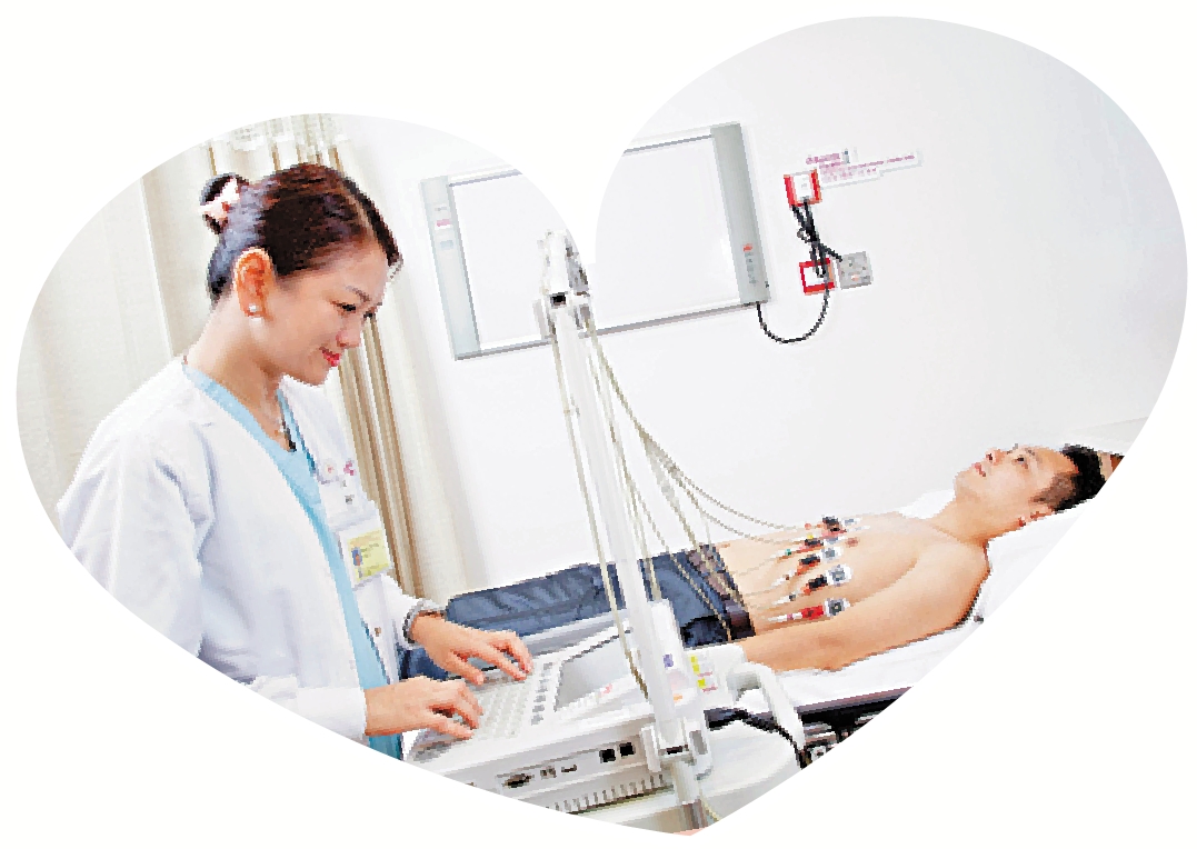 在醫生監測下,受檢者在跑步機上跑步並進行心電圖檢查。目的是檢視受檢者在心臟負荷增加的情況下,其心肺功能、血壓及心電圖的變化。