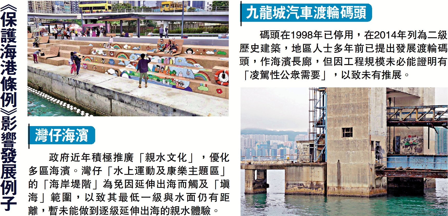 政府近年積極推廣「親水文化」,優化多區海濱。灣仔「水上運動及康樂主題區」的「海岸堤階」為免因延伸出海而觸及「填海」範圍,以致其最低一級與水面仍有距離,暫未能做到逐級延伸出海的親水體驗。