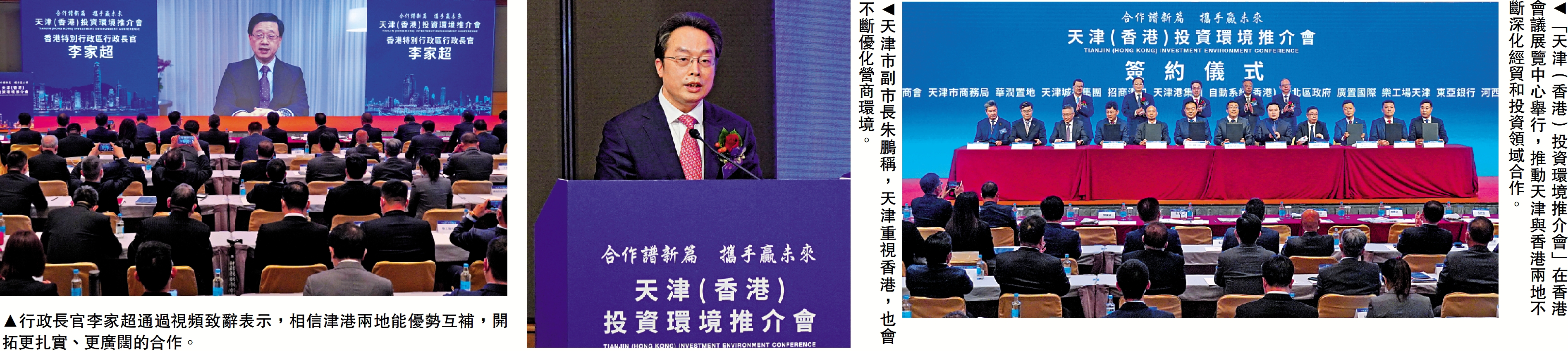 由天津市政府主辦、香港貿發局及本港主要商會等團體協辦的「天津(香港)投資環境推介會」昨日在灣仔會展中心舉行,現場簽約的津港兩地合作項目超過150億元人民幣(171億港元)。香港特別行政區行政長官李家超表示,香港與天津有不少共同的發展機遇,相信兩地能優勢互補。天津市副市長朱鵬表示,期望兩地在經貿、金融、科技產業、港口和人文等多個領域加強合作,共同攜手融入國家發展大局。\大公報記者 彭子河(文) 林少權(圖)