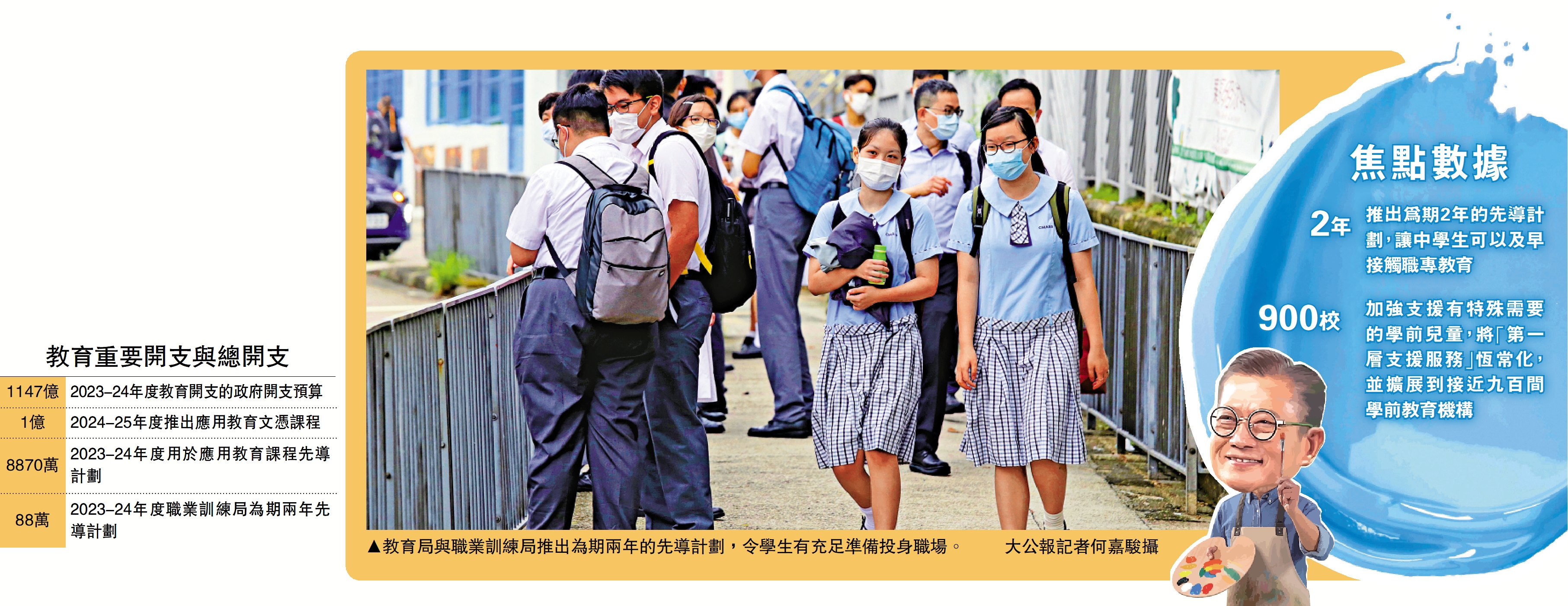 今次財政預算案中,2023-24年度教育方面的政府開支預算為1147億,佔總預算15.1%,在全部預算中最多的三甲。教育局由本學年起,將在職專教育方面恆常推出應用教育文憑課程,以取代毅進文憑課程,預算投入一億;更與職業訓練局(VTC)推出為期兩年的先導計劃令學生充足準備投身職場;並會繼續檢視「應用學位課程先導計劃」強化職專教育的進階路徑。團結香港基金助理研究總監、教育及青年研究主管郭凱傑表示,人才培養需要涵蓋各階段的發展,包括青年生涯規劃、完善升學階梯等;故此資源的投放不能只側重大專階段的實習。\大公報記者 張凱晴