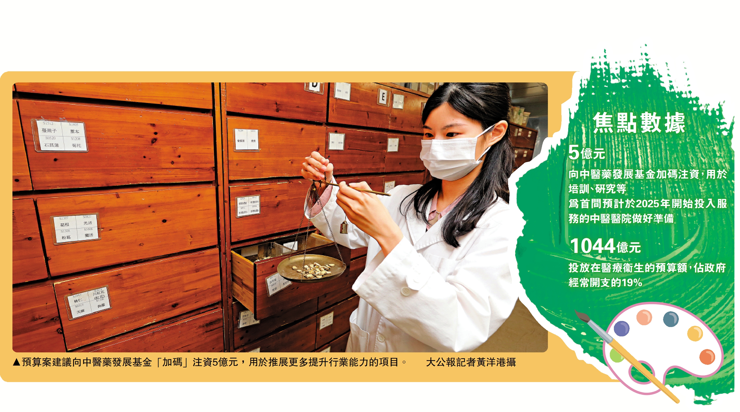 政府繼續投放大量資源在醫療衞生,財政司司長陳茂波昨日發表預算案,下年度醫療衞生預算達1044億元,佔政府經常開支總額約19%。為進一步推動中醫藥發展,預算案建議向中醫藥發展基金「加碼」注資5億元,用於推展更多提升行業能力的項目。中醫業界讚揚政府在巨大財赤下,仍增撥資源促進中醫藥業發展,體現對發展中醫藥的重視,但認為需有政策配合,例如「醫健通」平台應盡快打破中、西醫的「數據壁壘」,讓中醫可透過「醫健通」取閱西醫藥臨床資料。\大公報記者 王亞毛