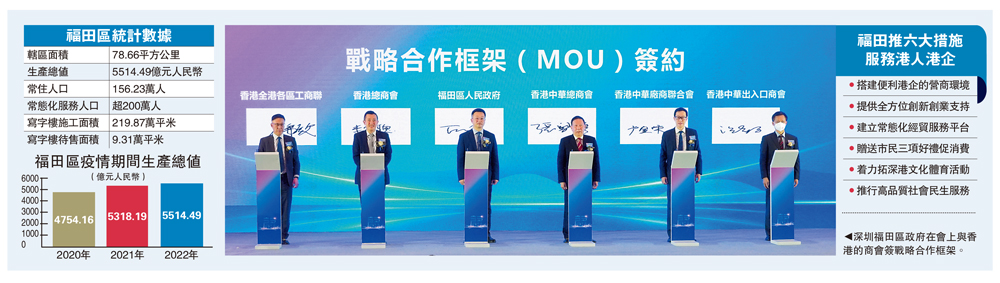 由深圳市商務局、深圳市福田區委區政府主辦的「福匯深港 共贏未來」──深圳(福田)─香港經貿合作交流會昨日在香港會議展覽中心舉行,這是全面通關後福田首次來港舉辦經貿交流會,香港政商界超過400人參加,大會共簽署協議25份,9項戰略合作框架(MOU)。福田區委書記黃偉表示,福田推出六大措施支持港人港企,包括為港商搭建高度便利營商環境,為港人度身定做包括創業在內的一系列支持政策。\大公報記者 蔣去悄(文)﹑林少權(圖)