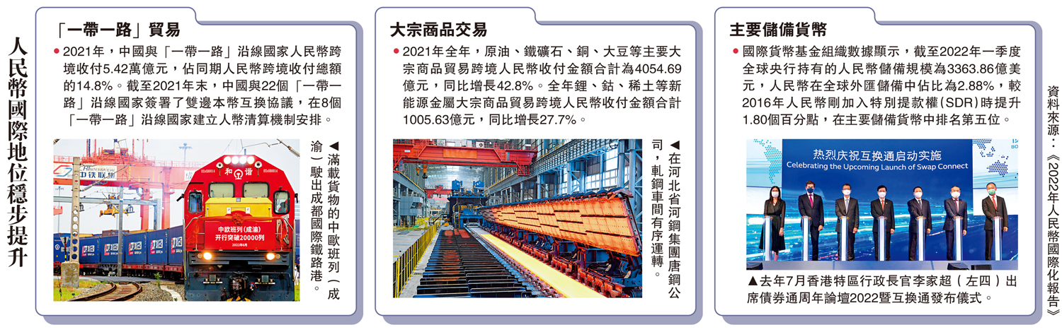 •2021年,中國與「一帶一路」沿線國家人民幣跨境收付5.42萬億元,佔同期人民幣跨境收付總額的14.8%。截至2021年末,中國與22個「一帶一路」沿線國家簽署了雙邊本幣互換協議,在8個「一帶一路」沿線國家建立人幣清算機制安排。