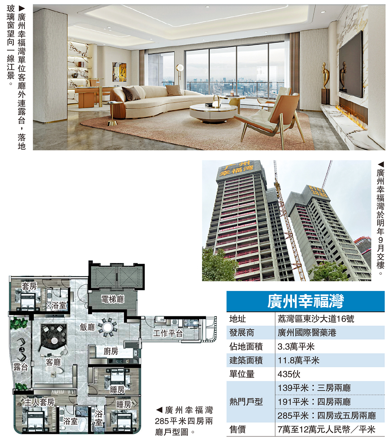 廣州幸福灣與廣鋼新城相隔不遠,是廣州國際健康港的住宅項目,地處白鵝潭核心,距離珠江僅約50米,擁有一線江景資源。該盤去年上半年開賣,近日加推建築面積285平米的大單位。