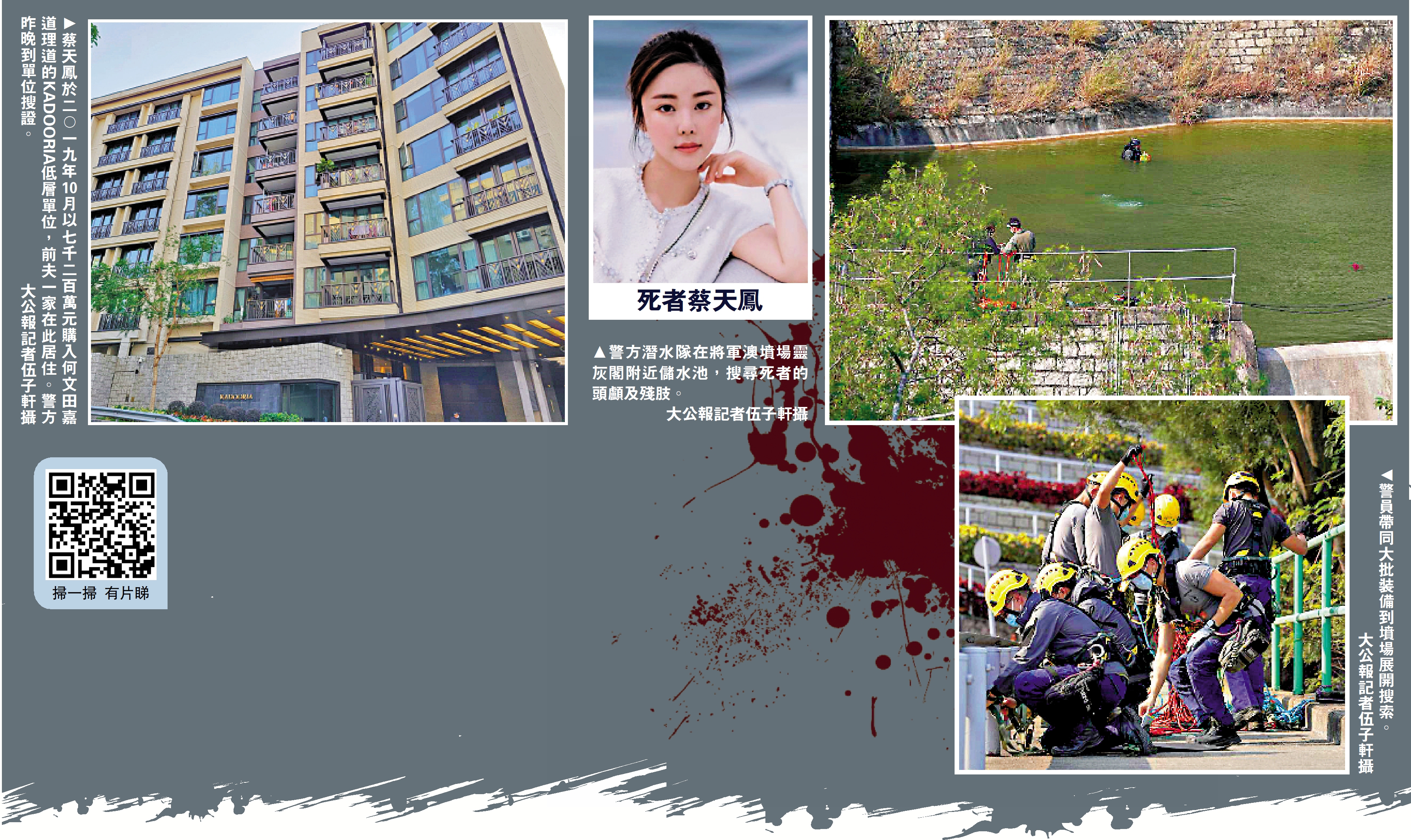 警方調查發現,疑犯在蔡天鳳失蹤期間曾駕車到將軍澳華人永遠墳場,懷疑他們把死者的頭顱、軀幹、手等殘肢棄屍於該處,甚至在儲水池內,昨日出動潛水隊(水鬼隊)、搜查隊、高空搜查隊、機動部隊、警犬隊及無人機隊共100人,展開地氈式搜索,範圍包括靈灰閣附近第一號儲水池。據了解,該儲水池用於墳場內灌溉。