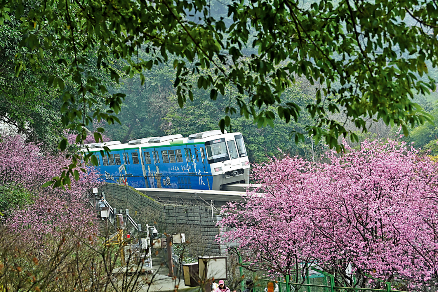 隨着天氣轉暖,重慶軌道交通二號線佛圖關段大面積美人梅競相綻放,單軌列車穿行在「花海」中,被網友們稱為重慶版「開往春天的列車」。\香港中通社
