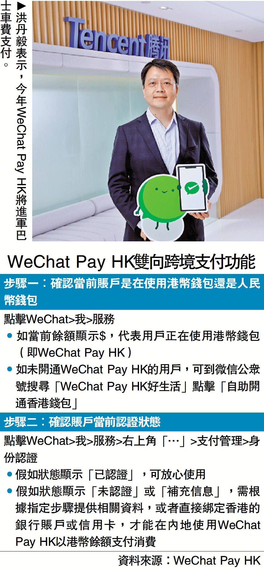 香港與內地在2月6日起全面通關,洪丹毅分享通關消費數據指,首3個星期(2月6日至2月28日)與通關前同期(12月6日至12月28日)比較,港人到內地、澳門和日本進行消費的線下跨境交易使用者人數升12倍,交易筆數升7倍。現時,WeChat Pay HK設有雙向跨境支付,港人可在超過100萬內地商戶,使用WeChat Pay HK港幣錢包付款,毋須綁定內地銀行卡,人民幣消費金額亦會自動轉換成港幣,以港幣結算。