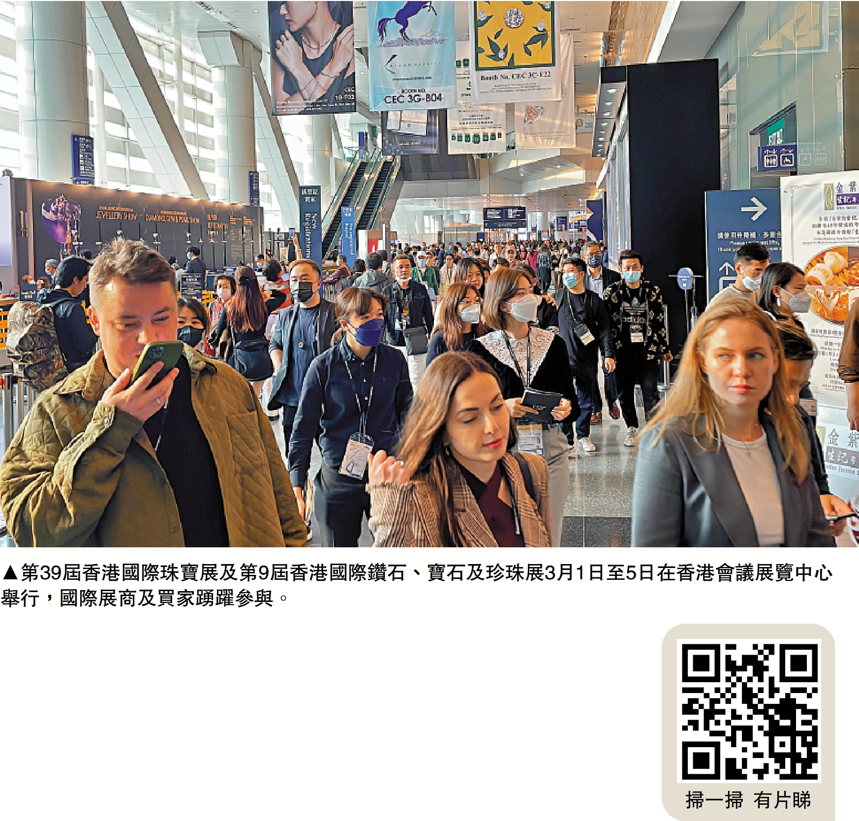 復常拚經濟!口罩令撤銷後首個大型國際展覽,正於香港會議展覽中心舉行,昨日第二天展覽,場內繼續人聲鼎沸。有參展的本地珠寶設計師表示,隨着香港全面結束社交距離限制,熱鬧情況已回復至疫前水平,商機無限,整體生意額比疫前(2019年)大幅增長20%至30%;亦有參展商雀躍表示,「可以用人山人海來形容!」有海外參展商指出,香港市場很重要,他們認為期待已久的活力已經重臨香港。\大公報記者 賴蘇武(圖/文)