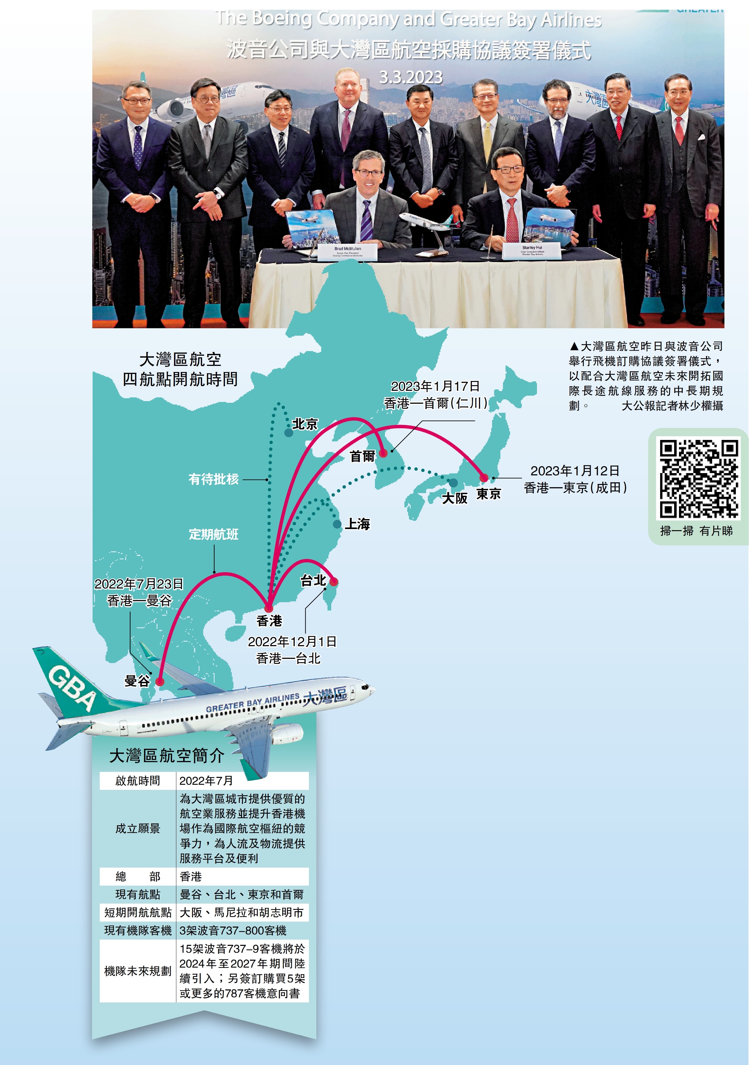大灣區航空與波音公司昨日在港舉行飛機訂購協議簽署儀式,大灣區航空將於2024年至2027年期間,從波音公司陸續引入合共15架737-9客機;另簽署意向書,購買5架787 Dreamliners(夢幻客機)。大灣區航空主席黃楚標指出,該批訂單有助公司開拓更多航點,及配合公司未來中長期的發展計劃,逐步從中短途航點網絡,發展至洲際、更長途的航班。\大公報記者 林靜文 蔣去悄
