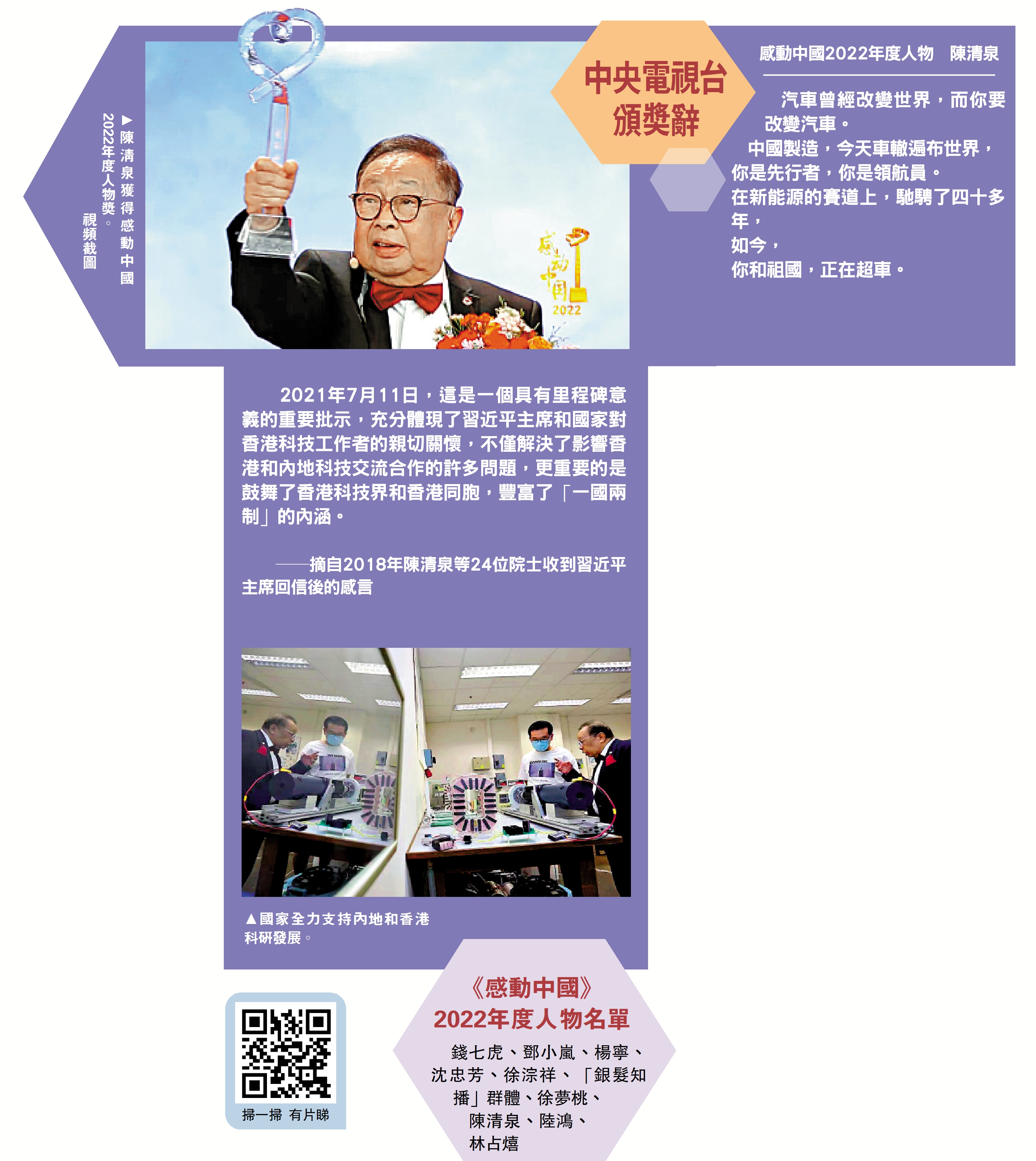 感動中國2022年度人物昨晚(4日)揭曉。中國工程院院士、第十屆全國政協委員、中國能源學會副會長、香港大學教授陳清泉院士榮獲「感動中國2022年度人物」獎。陳清泉是第一位中國工程院香港院士,他始終心懷祖國、心繫香港,為香港創新科技發展貢獻力量。