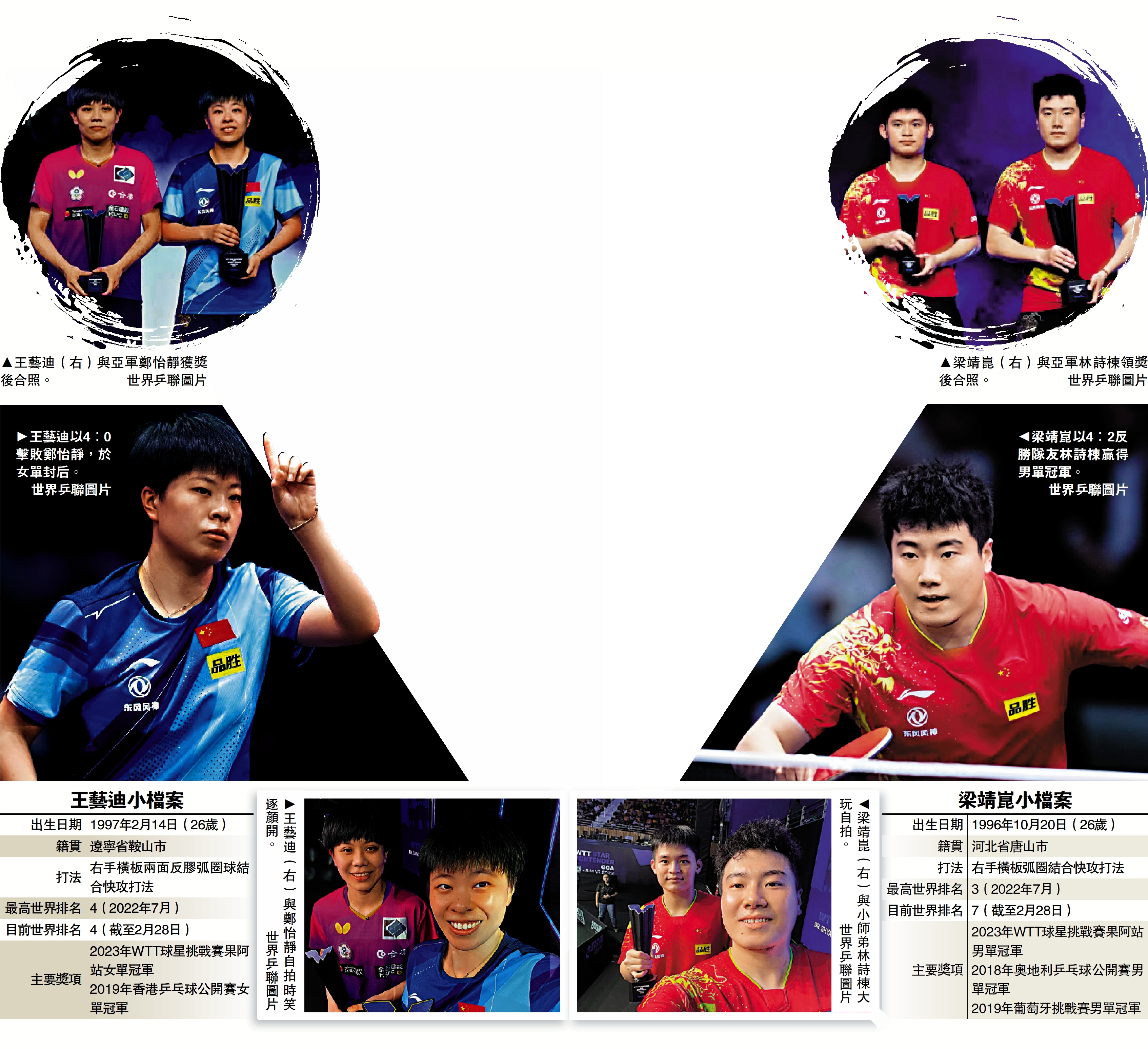 【大公報訊】世界乒乓球職業大聯盟(WTT)球星挑戰賽果阿站5日收官,男單決賽梁靖崑苦戰六局以4:2逆轉隊友林詩棟奪冠;頭號種子、中國隊的王藝迪以4:0擊敗中國台北選手鄭怡靜,奪得女單冠軍。