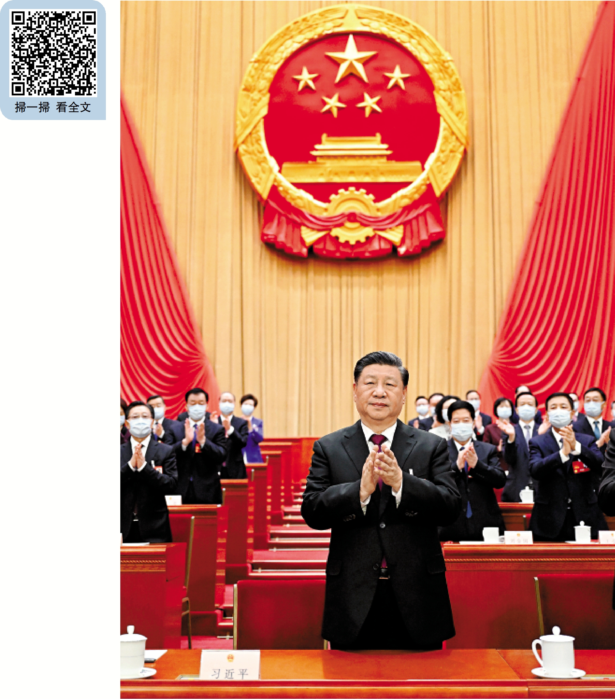 這是莊嚴的時刻──國徽高懸,熠熠生輝。習近平面向近3000名全國人大代表宣讀誓詞:「我宣誓:忠於中華人民共和國憲法,維護憲法權威,履行法定職責,忠於祖國、忠於人民,恪盡職守、廉潔奉公,接受人民監督,為建設富強民主文明和諧美麗的社會主義現代化強國努力奮鬥!」