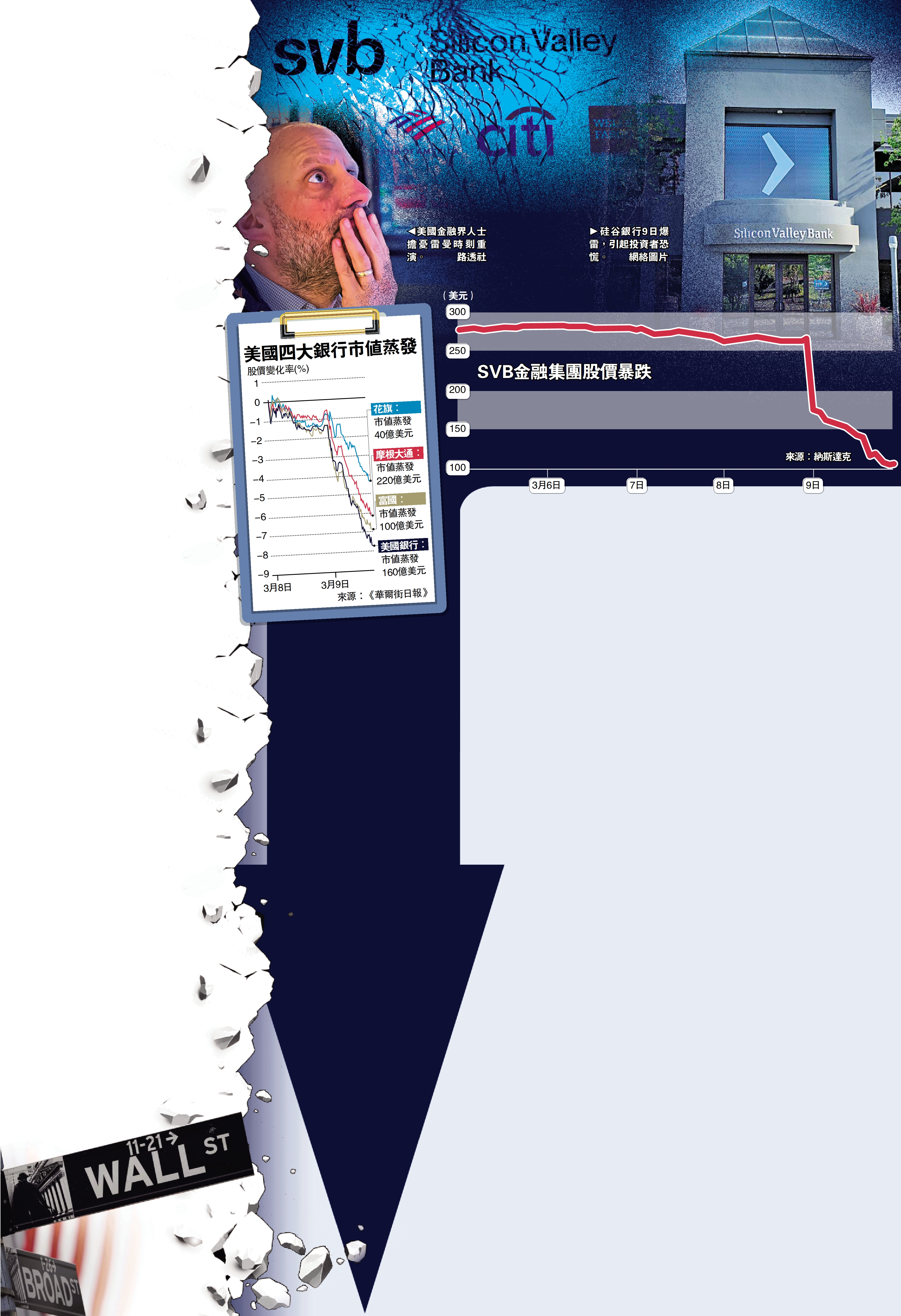 硅谷銀行是全美第16大銀行,此前一向運營良好,如今爆雷引起投資者恐慌,美國金融股哀鴻遍野。9日,美國四大銀行花旗、摩根大通、富國和美國銀行股價齊齊下跌,市值共蒸發約520億美元。彭博社表示,金融業擔憂這可能是一場更嚴重危機的開始。經濟學家、市場分析和數據智能公司Exante Data創始人諾狄格說:「大家都在問,下一個會是誰?」