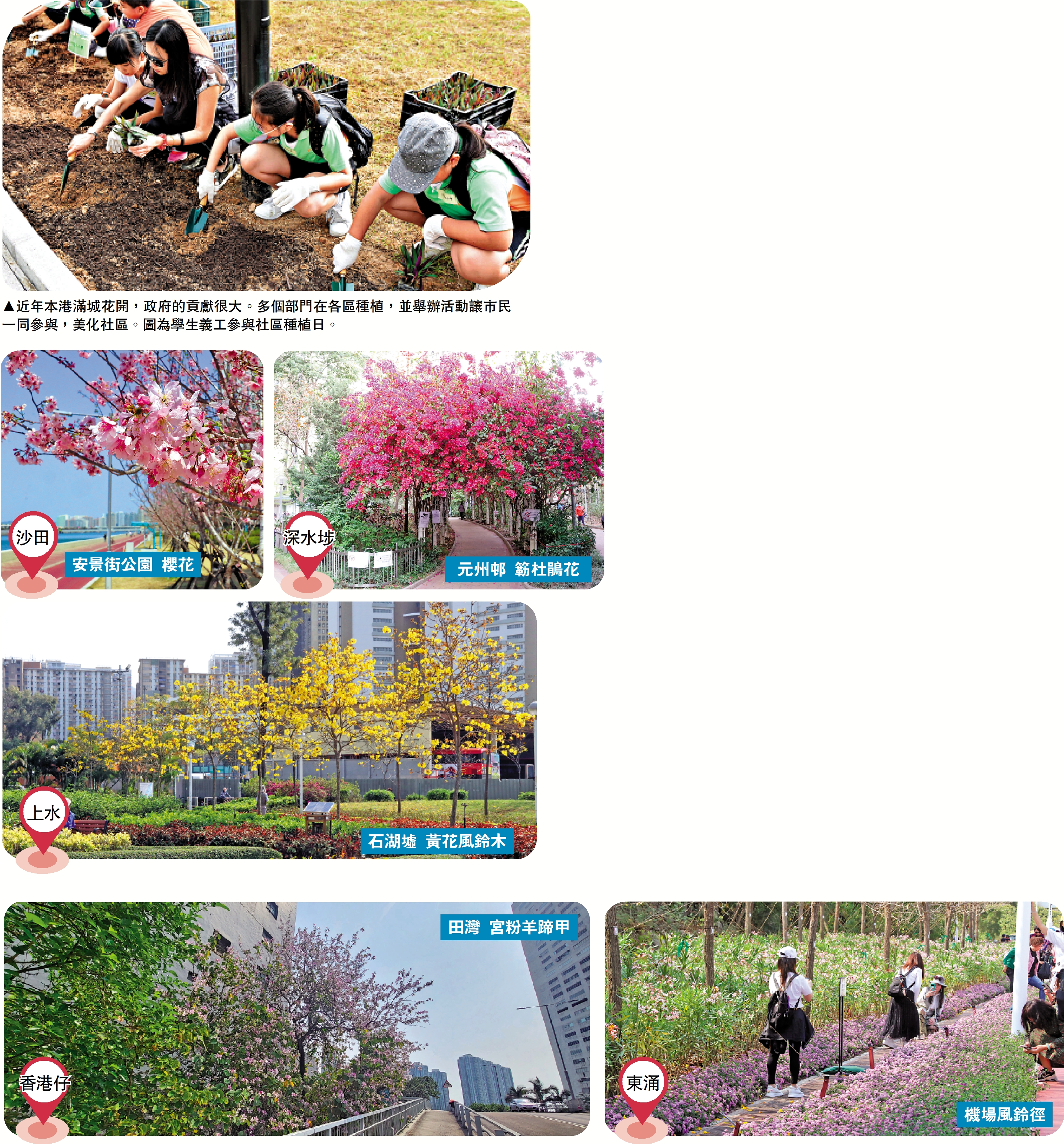 車輪梅、禾雀花、宮粉羊蹄甲、白花羊蹄甲、黃花風鈴木、紅花風鈴木、紅棉、緋寒櫻、簕杜鵑花、杜鵑花、映山紅、藍花楹、白千層、雞蛋花、樹頭菜、銀珠。