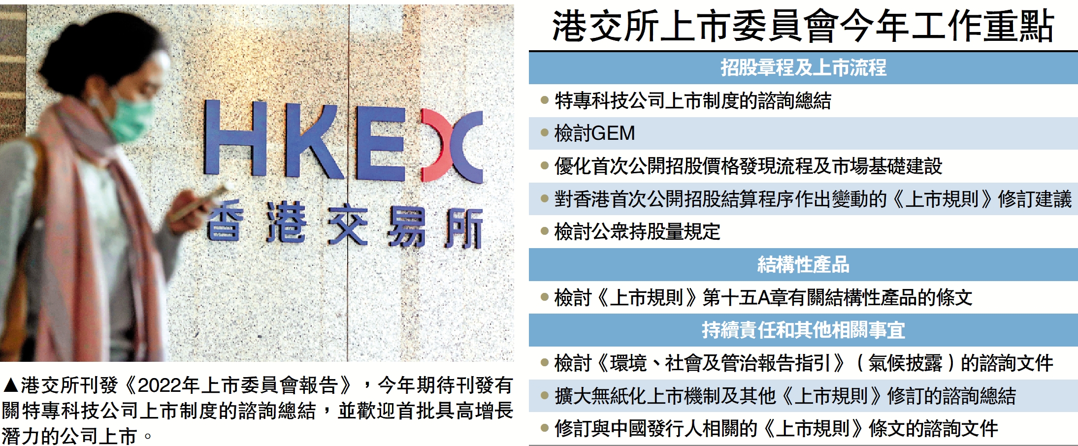 【大公報訊】港交所昨日刊發《2022年上市委員會報告》,回顧上市委員會2022年的工作,並展望2023年及以後的政策方向。報告指2023年及以後的工作重心將會繼續兩方面兼顧,包括發展香港市場及提升市場質素。
