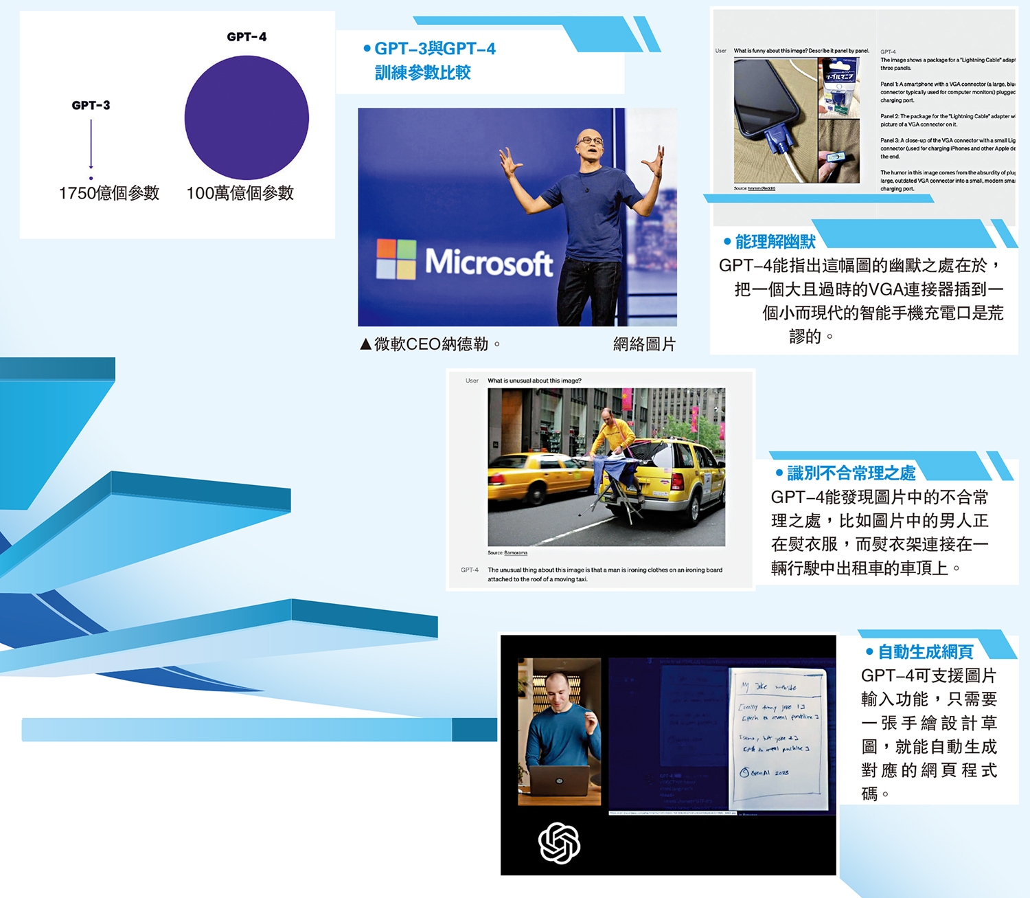 令人驚喜的是,GPT-4還加入解析圖像的功能。針對用戶發送的圖片,GPT-4除了可解釋內容以外,還能給予建議、回答問題。在官方演示中,GPT-4幾乎就只花了1-2秒的時間,就識別了手繪圖片,並根據要求手繪圖片上的文字,實時生成了網頁代碼,製作出了相應的網站。不過,GPT-4目前僅開放給部分訂閱ChatGPT Plus的付費用戶,收費為每月20美元。同時,圖像輸入功能暫未向公眾開放。