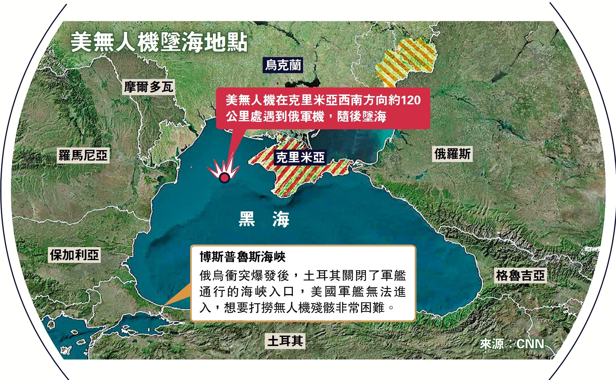 【大公報訊】綜合《紐約時報》、BBC、今日俄羅斯報道:美國歐洲司令部14日稱,一架美國MQ-9死神無人機在黑海上空遭兩架俄羅斯蘇-27戰機攔截和撞擊,最終墜毀在克里米亞半島附近。美媒稱,這是俄烏衝突爆發一年多以來,美俄軍方首次直接對抗。俄國防部反駁美方說法,表示俄戰機並未與美方無人機接觸,無人機因動作失控而墜海。由於土耳其禁止外國軍隊進入黑海,如何打撈無人機殘骸成為美方面臨的難題。