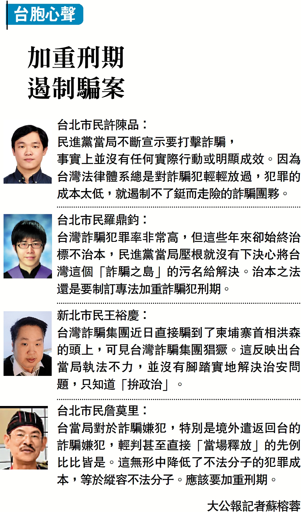 台灣詐騙犯罪率非常高,但這些年來卻始終治標不治本,民進黨當局壓根就沒有下決心將台灣這個「詐騙之島」的污名給解決。治本之法還是要制訂專法加重詐騙犯刑期。